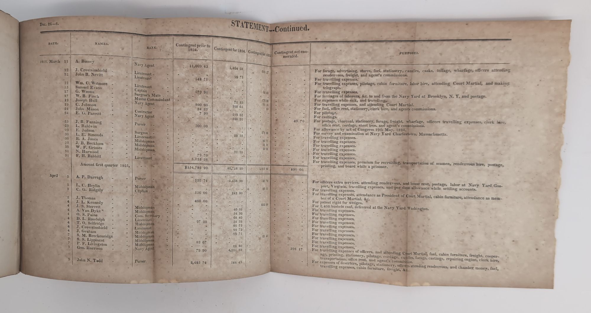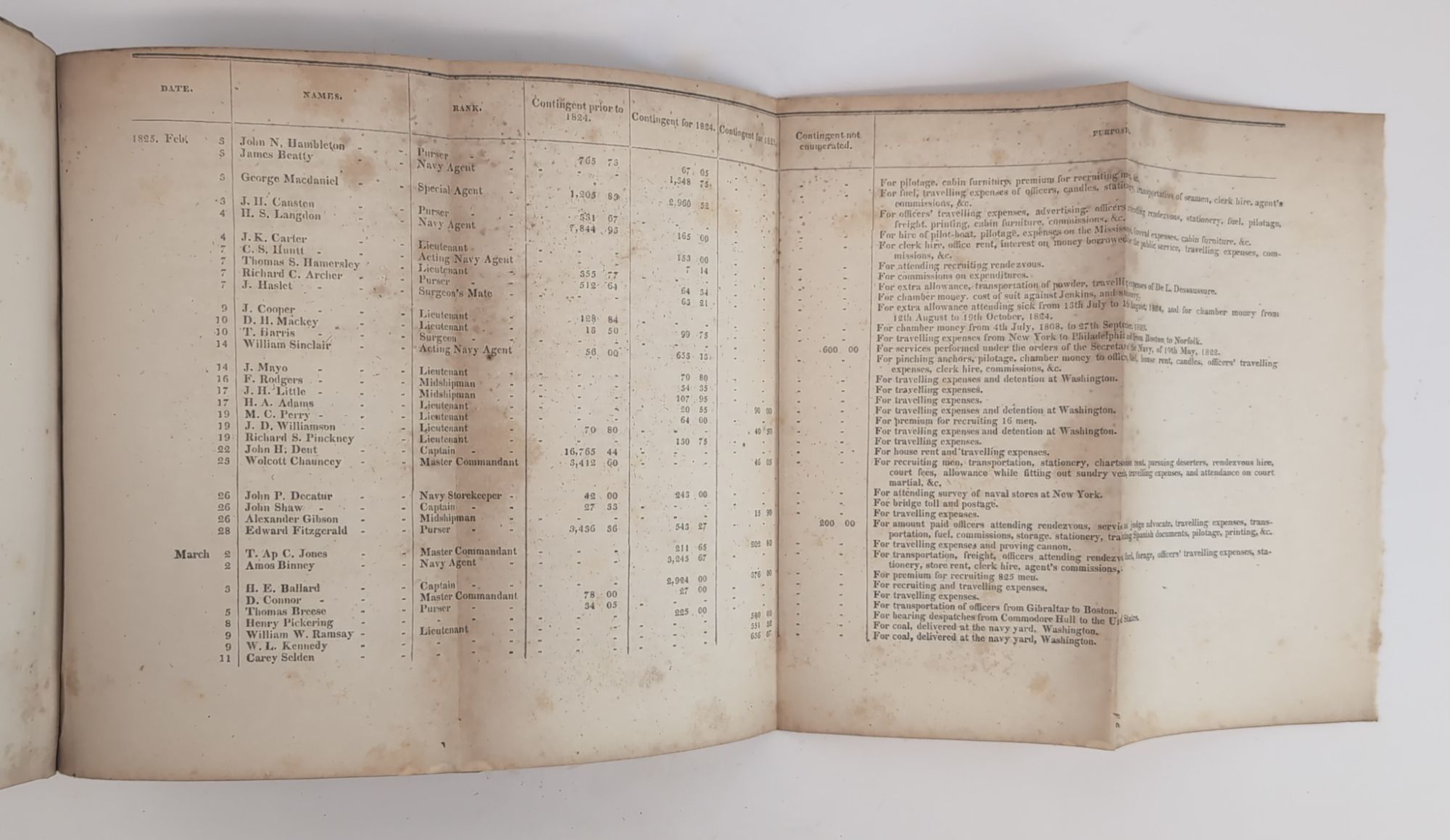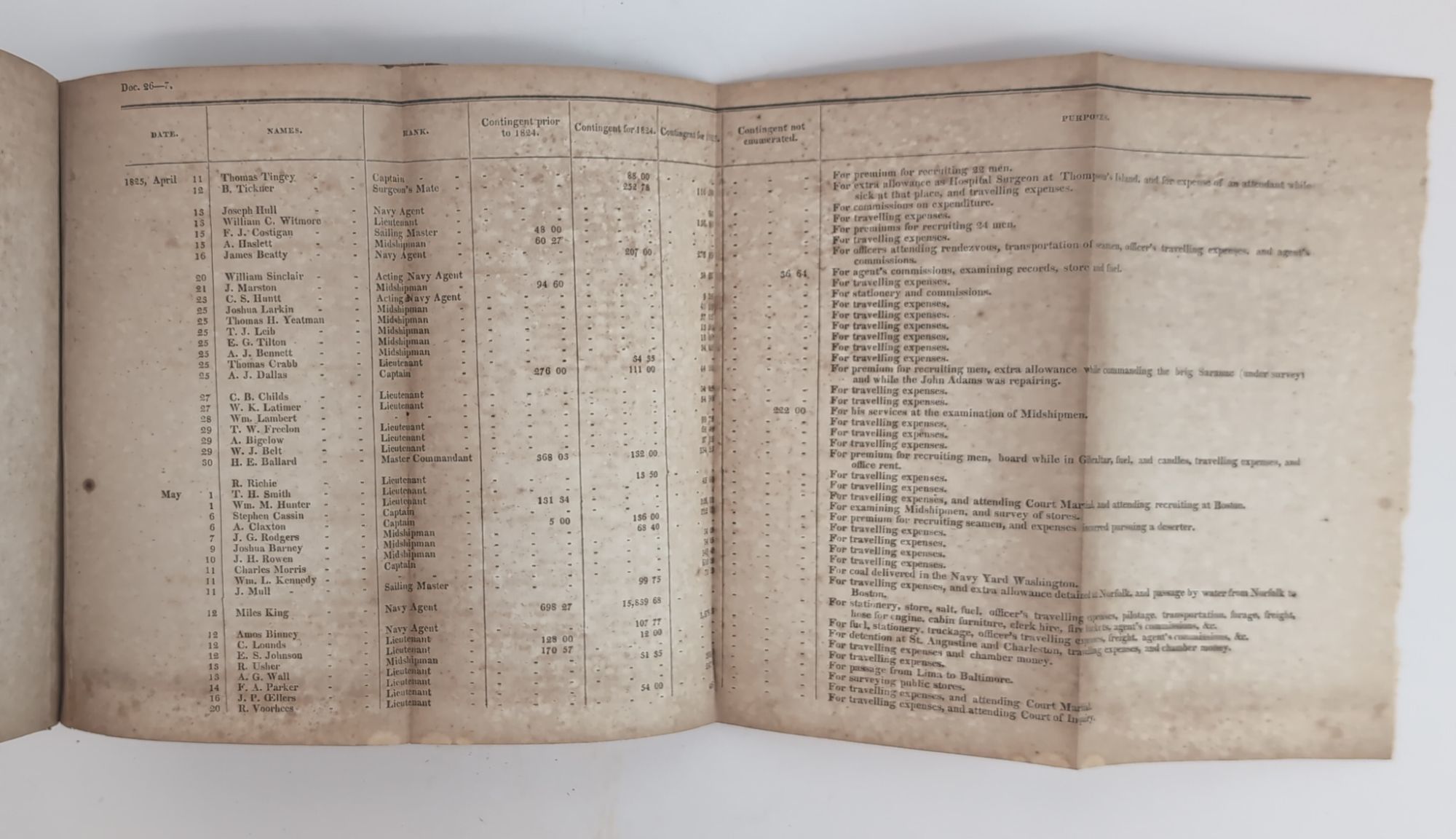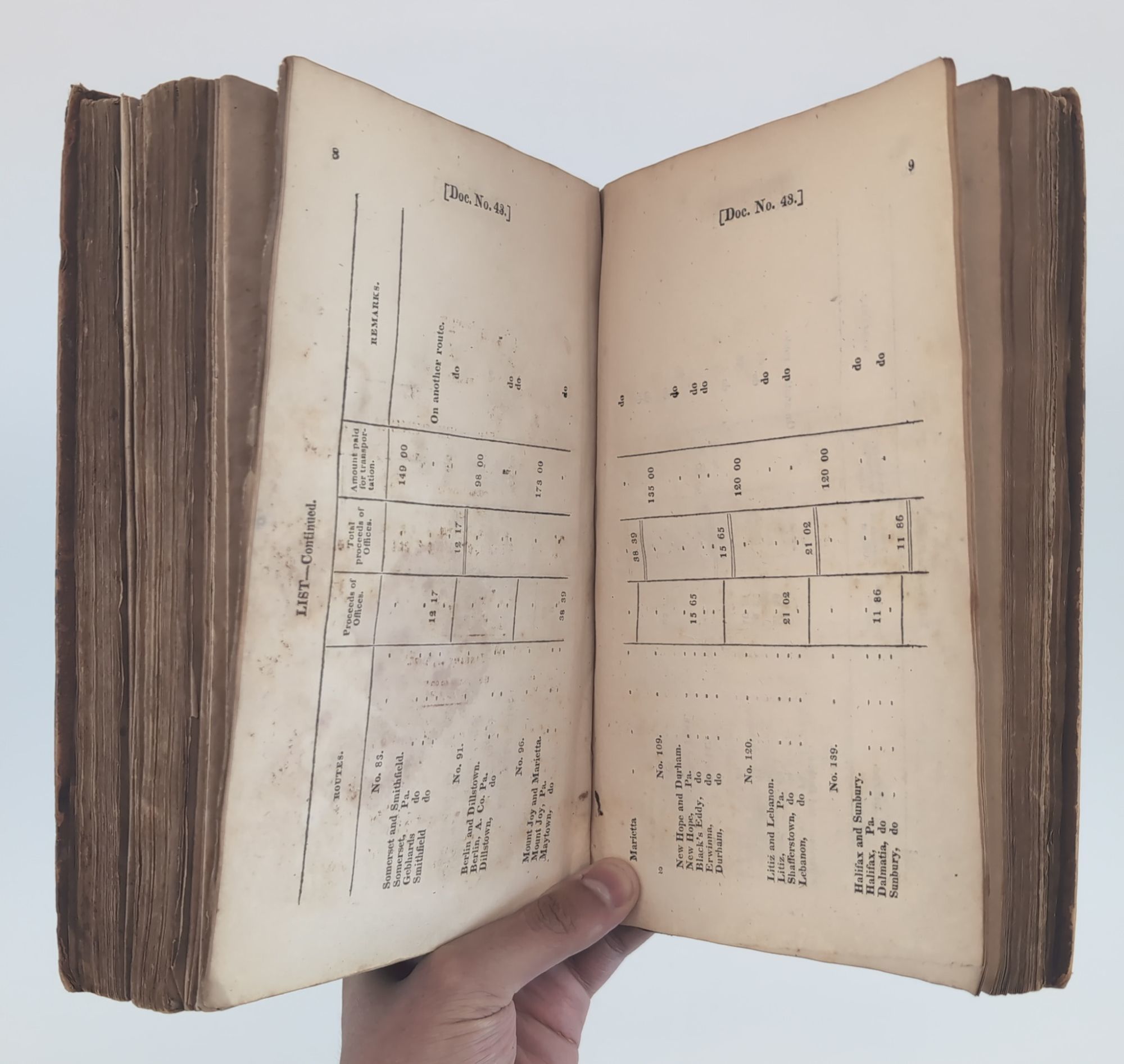 Washington, D.C.: Gales & Seaton, 1826. First Edition. Hardcover. Octavo, 29 parts. In Good condition. Bound in full contemporary brown leather, label missing from spine; Boards show substantial wear to all edges and surfaces, the front cover has split along the joint (but still attached/intact), chipping at the head/tail of spine, and leather rust overall; Text block has varying degrees of age-toning throughout, and sporadic foxing; nameplate of former owner appears on front paste-down; mild foxing throughout; includes 41 fold-out plates, as issued, with some foxing; Shelved in Room G. 1346778. Special Collections.