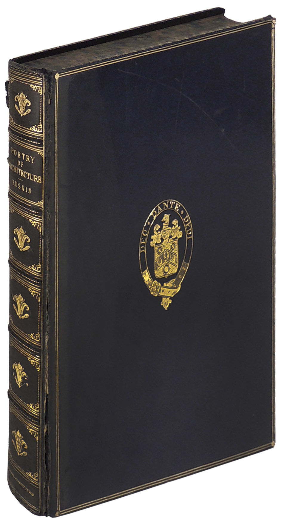 London: George Allen, 1893. Hardcover. Very Good. Hardcover. This text is substantially a reprint of essays originally published in London's Architectural Magazine beginning in 1837. The essays are in two parts: the first describing the cottages of England, France, Switzerland, and Italy. The second part is on the villas of Italy and England. The illustrations are taken from drawings by Ruskin, done as a series of plates "executed in the best possible style of photogravure" [Introduction]. There are fourteen plates, a color frontispiece, and fourteen text illustrations. Bound in full dark blue leather with raised bands on spine with gilt titling and fleurs de lis. On the cover is a gilt oval seal with a figure in the middle and the words "Deo Dante Dedi" [I have given to God] encircling it. The leather is somewhat worn and the spine has faded . Marbled endpapers and paper edges. The front hinge is cracked and weak, and a previous owner used non-archival tape along the hinge to strengthen it. Rear joint and hinge are also tender. Interior pages are quite clean. Save for binding issues in very good condition. Measures 8.5 x 11 inches. viii; 261 pages. ARCHITECT/092821.