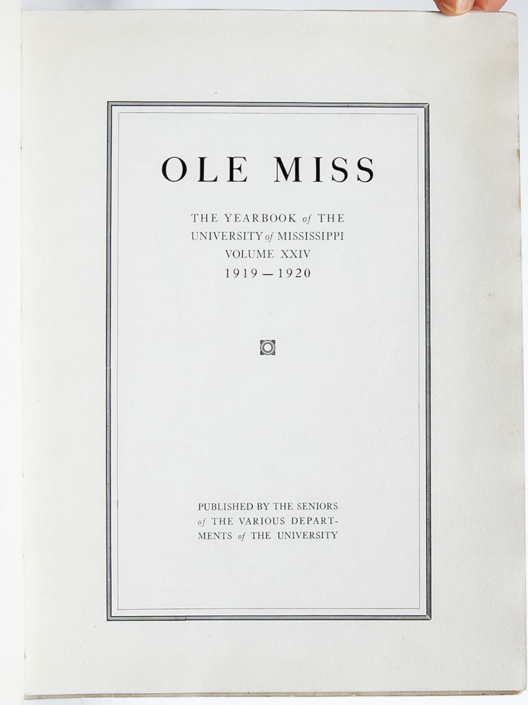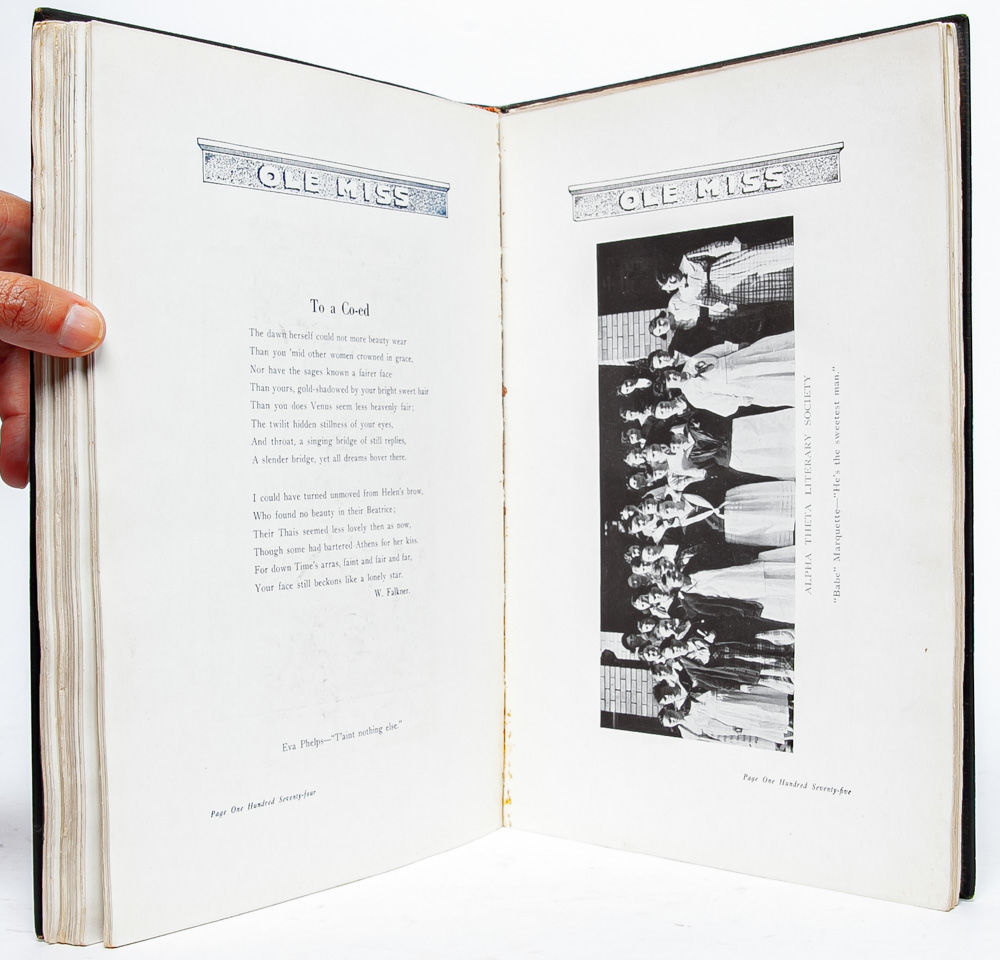 [Oxford, Mississippi], 1920. First edition. Embossed sheep over card, stamped in gilt to front board. Marbled endpapers. A bit of rubbing and shelfwear to covers; spine cracked and several signatures loose but in all holding well. Ownership stamp to front pastedown. Internally a pleasing example, with minimal wear and no marking. A Fine copy of this scarce piece, which does not appear in the auction record and of which there is no other example on the market; the present yearbook contains Faulkner's first literary appearance in book form, his poem To a Co-Ed (page 174).