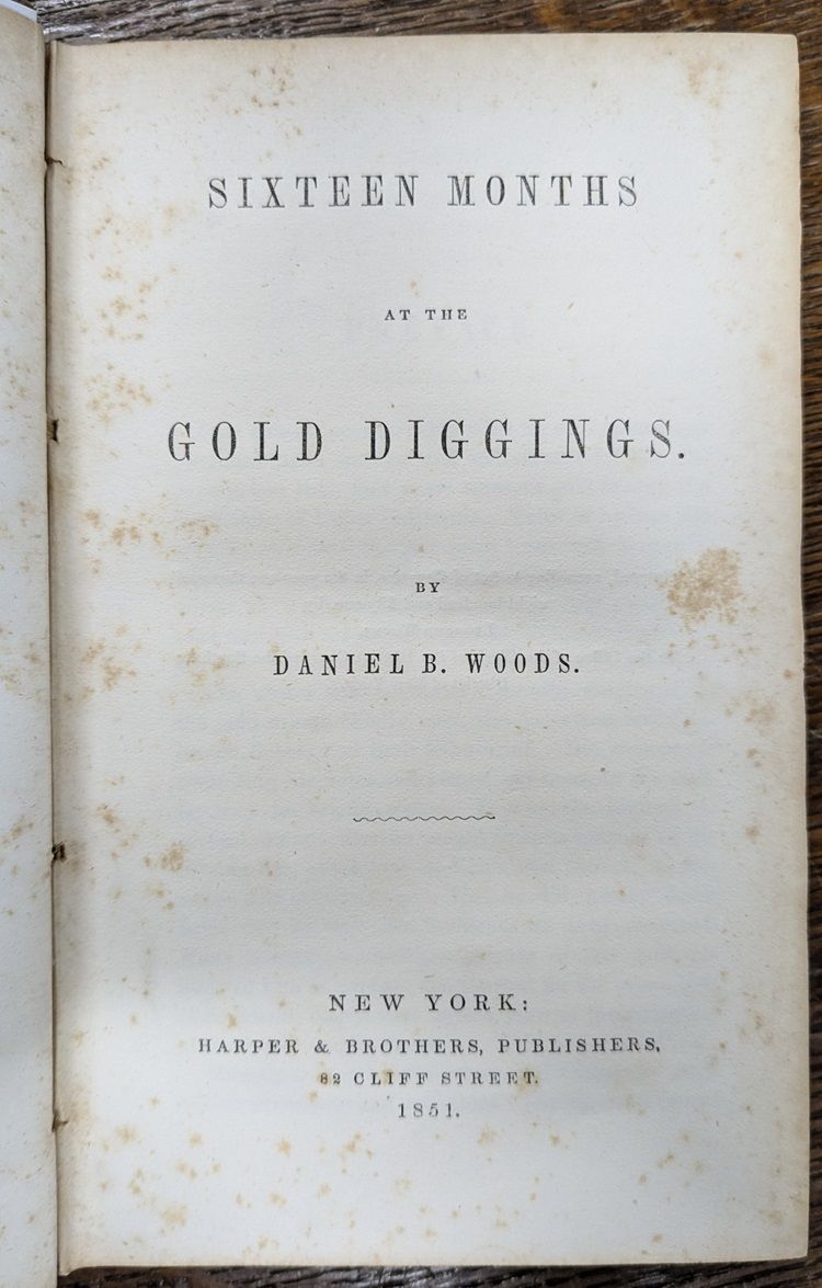 New York: Harper & Brothers, Publishers, 1851. First edition. Hardcover. Very good. 199; 6pp. Duodecimo [19 cm] Brown floral embossed cloth over boards with a gilt stamped title on the backstrip. Six pages of publisher's advertisements at the rear. Slight slope to the spine. Light internal foxing, with roughly a dozen pages showing more prominent foxing. Underlining and marking in pencil on p. 42. An attractive copy. Howes W-651. Graff 4741. Zamorano 80, 80. The author's recounting of his experiences as a prospector in the California Mines. "Harper's New Monthly Magazine, Volume IV" referred to his account in this way, "Becoming a miner among the miners, he had the most ample opportunities to learn their conditions, their prospects, their sufferings, and their rewards. He describes plainly what he saw. He borrows no colors from the fancy... Eminently free from exaggeration, it shows the hardships by which the gold of California was procured on the first discovery of the placers. Its tendency is to discourage emigration. He would advise those that are tolerably well off at home to be content.
