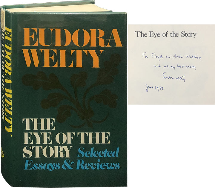 New York: Random House, 1978. First Edition. Hardcover. Very Good/Fine. Presentation copy inscribed by Welty to emeritus professor at Emory University Floyd Watkins and his wife Anne. Very Good in a Fine jacket, unclipped ($10.00). Quarter green cloth with green paper on the boards. Square and firmly bound, a stain at the top and bottom edges near the spine, clean internally. A collection of Welty's nonfiction pieces, spanning from literary criticism on the likes of Chekhov, Austen, Forster, Cather, Porter, Faulkner, Woolf, and others, to fairy tales, folklore, and Mississippi cooking.