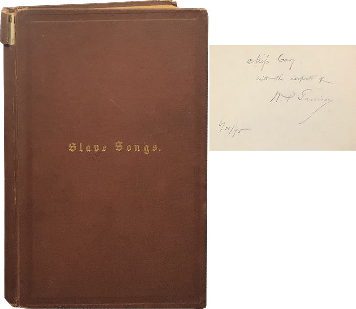 New York: A. Simpson and Co, 1867. First Edition. Hardcover. Good. Introduction by Allen, Charles Pickard Ware, and Lucy McKim Garrison. Inscribed by a Garrison family member on the half-title page. Good. Lighty Brown cloth, splitting along the front joint and with a tear across the spine, clean otherwise. Square and firmly bound with brown endpapers, clean internally. The first collection of American "slave" music arranged by four regions: South Eastern Slave States, Northern Seaboard Slave States, Inland Slave States, and Gulf States. This copy bears an inscription possibly belonging to Wendell Phillips Garrison, who was the husband of Lucy McKim Garrison--one of the authors of this work--and the son of William Lloyd Garrison.
