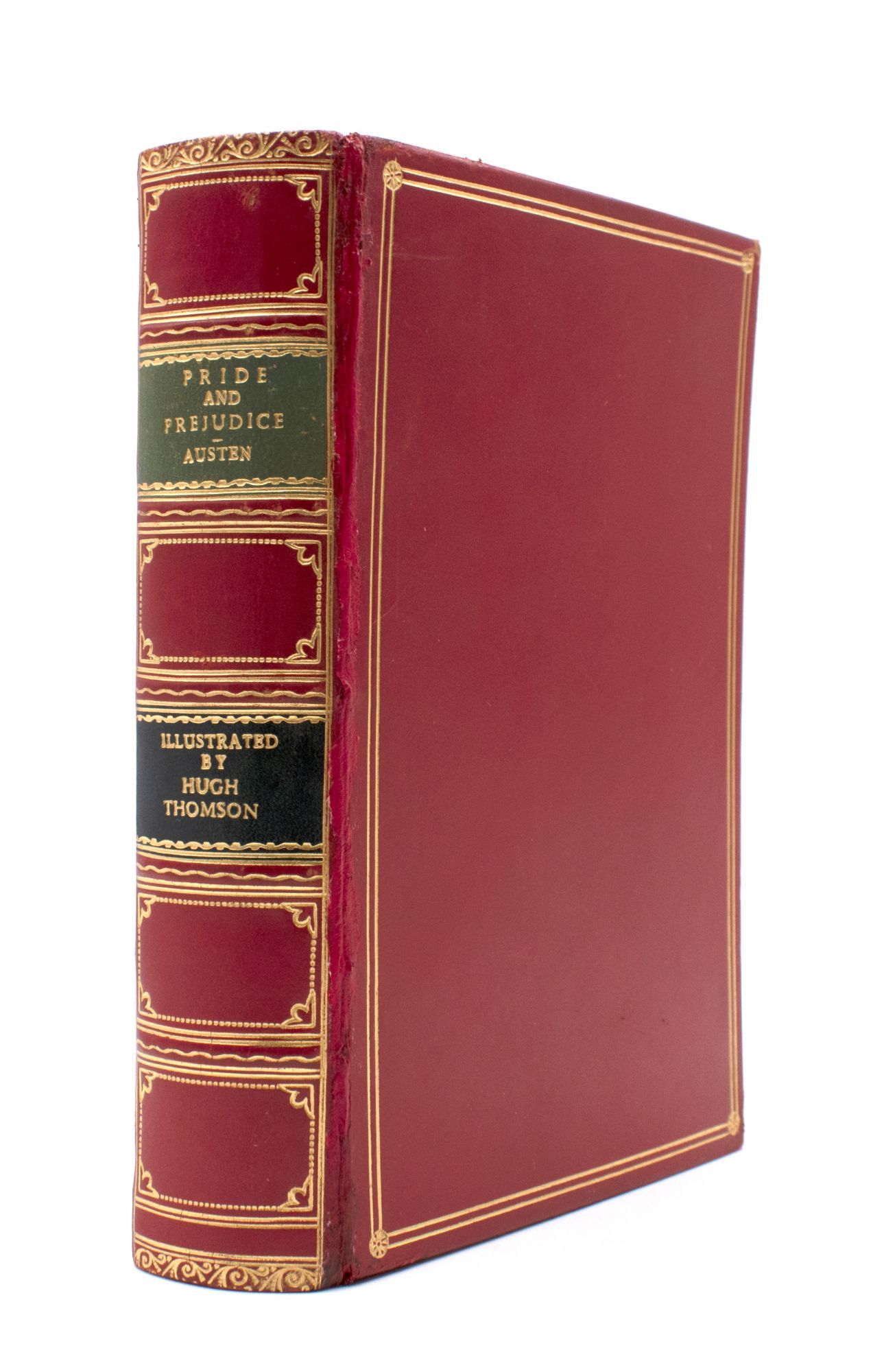 London: George Allen Ruskin House 156 Charing Cross Road, 1894. First Trade edition. Illustrated by Hugh Thomson with the plates on Tissue and tipped in. xxvii, [1], 476, [1] pp. Printed at the Chiswick Press. 1 vols. 4to. Red polished calf, all edges gilt. Front hinge starting. Iconic Hugh Thompson cloth binding bound in at rear. Contemporary gift inscription to endpaper. Thomson, Hugh. First Trade edition. Illustrated by Hugh Thomson with the plates on Tissue and tipped in. xxvii, [1], 476, [1] pp. Printed at the Chiswick Press. 1 vols. 4to. In the late 1880’s and through the 90’s, a remarkable illustrator made his appearance on the London scene: Hugh Thomson (1860-1920), perhaps the pre-eminent representative of what has come to be known as ‘the Wig and Powder School’ of English illustration. Thomson’s delicate pen drawings of English life lent themselves perfectly to the new technique of photo-engraving (he was a pioneeer of the genre) and he was soon in popular demand for illustrations of the novels of Jane Austen, Fanny burney, Mrs. Gaskell, Charles Reade, as well as for contemporaries like Austin Dobson. His influence on contemporary illustrators was felt keenly for many years, and can be seen in the work of Charles E. Brock and others of the ‘school.’.