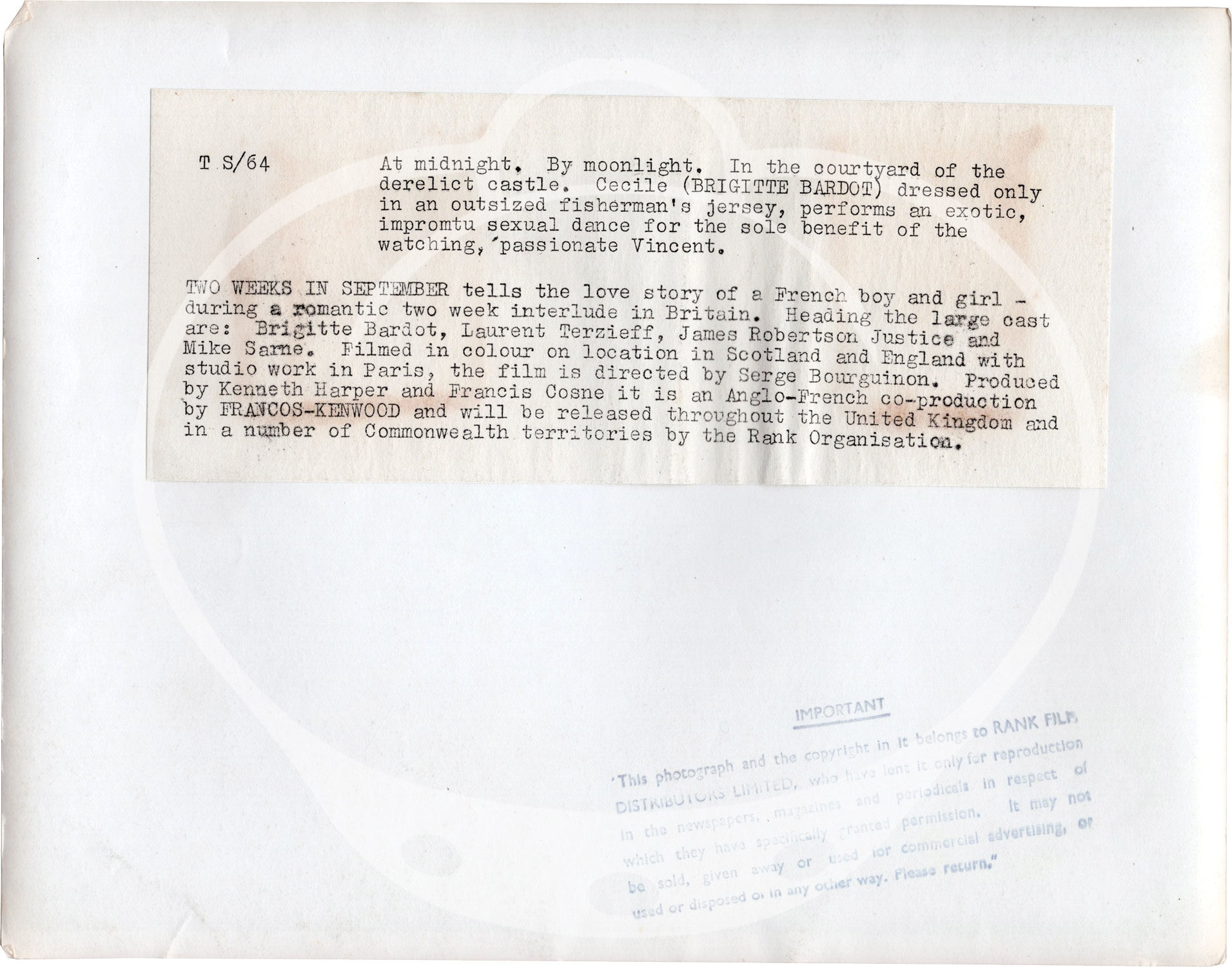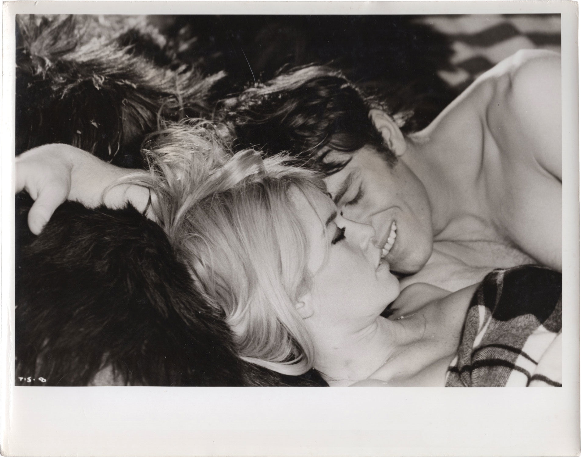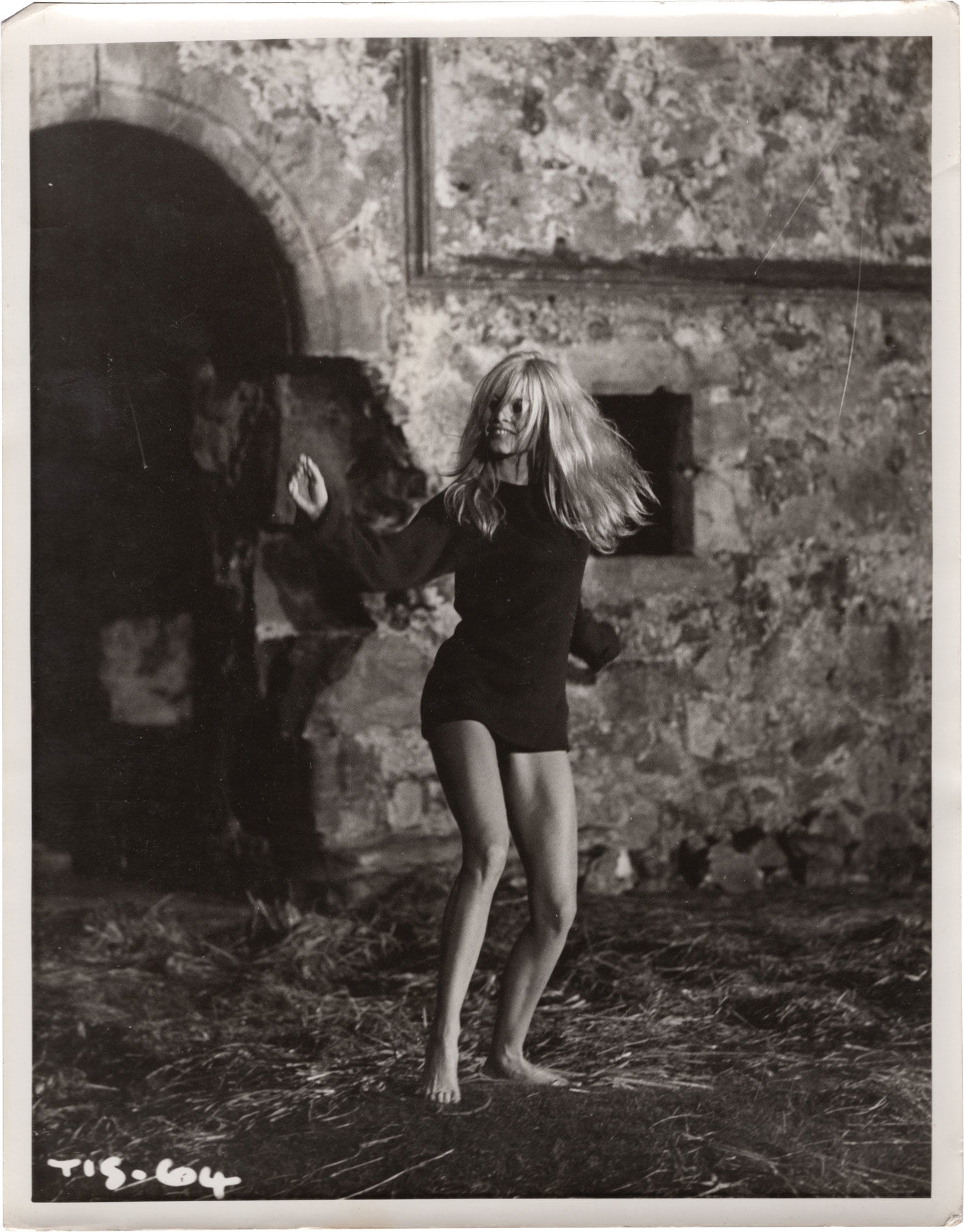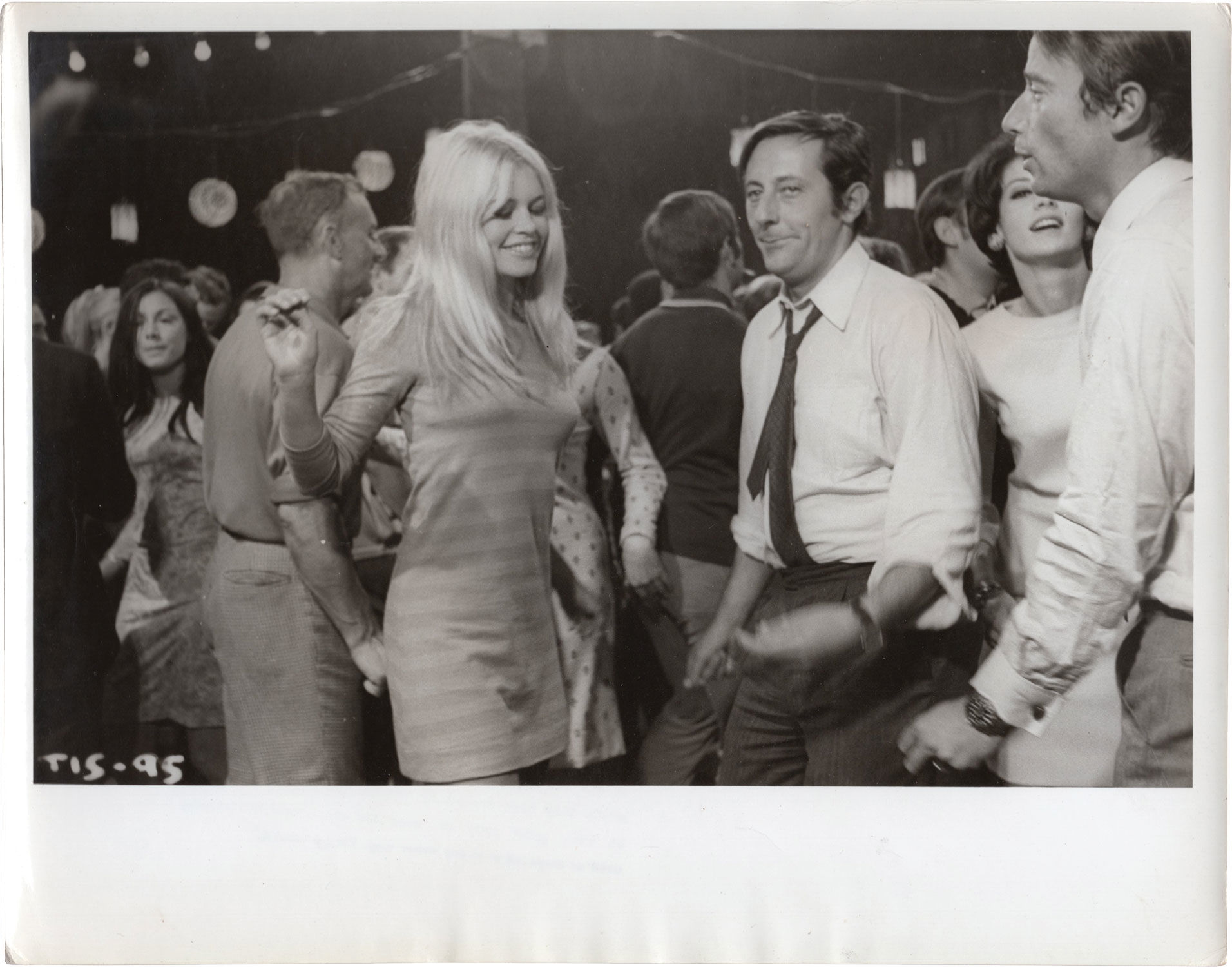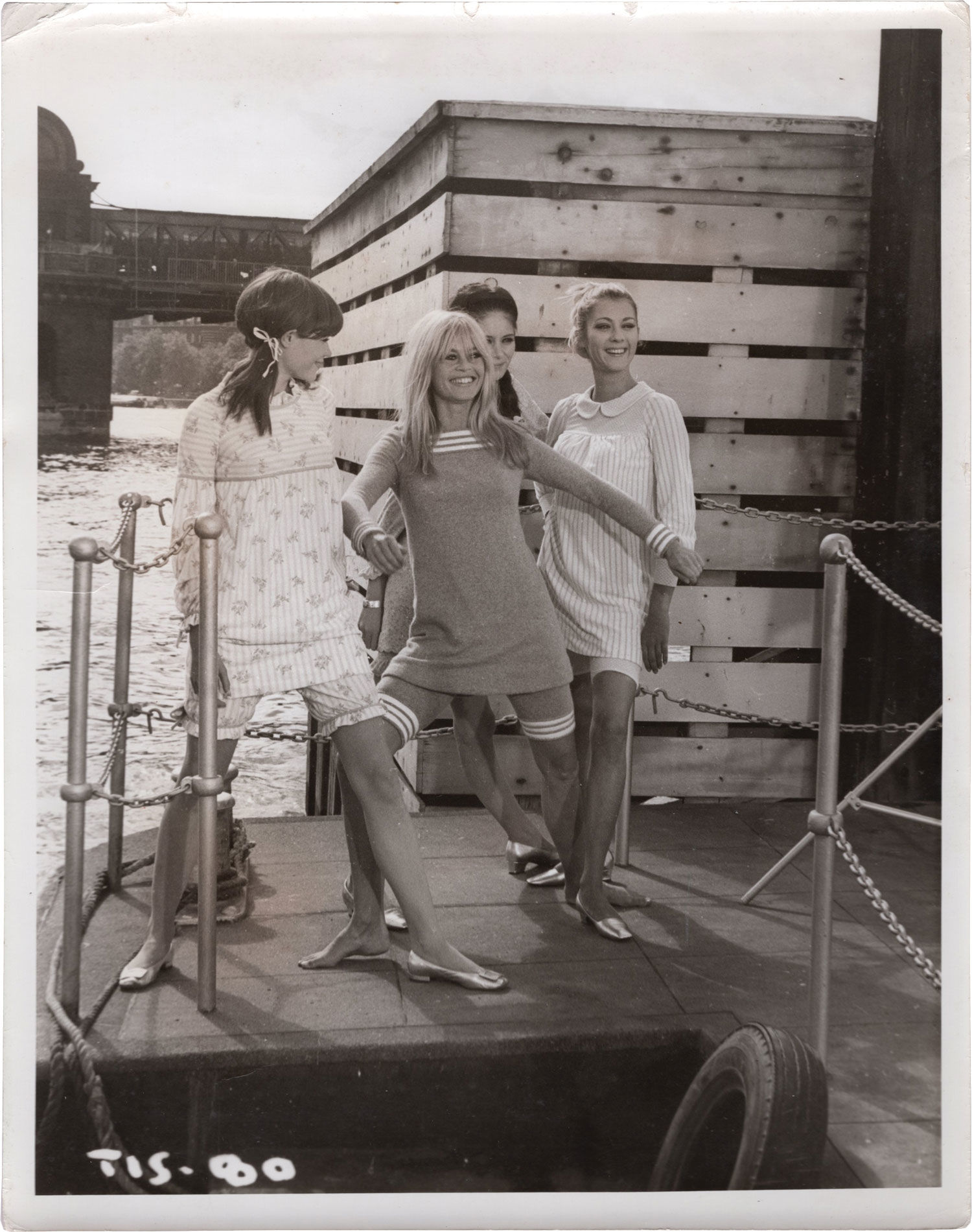 Los Angeles: Paramount Pictures, 1967. Five vintage reference photographs from the 1967 film, all featuring actress Brigitte Bardot. Four with printed mimeo snipes affixed to the verso.