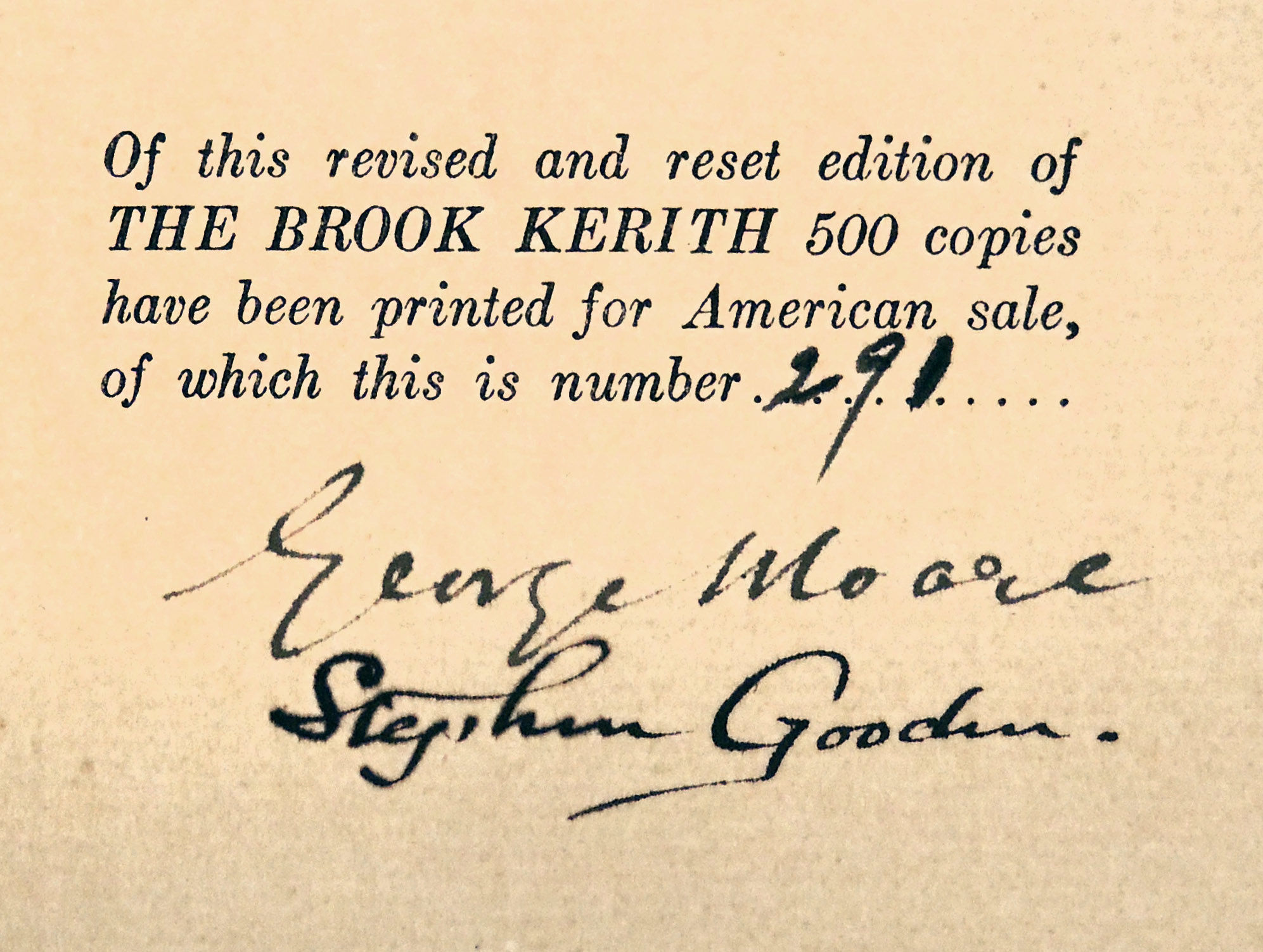 New York: Macmillan Company, 1929. Hardcover. Very Good. Hardcover. LIMITED EDITION. Number 291 of 500 copies signed by the author and the illustrator. George Moore (1852-1933) was a Roman Catholic Irish writer, art critic, and dramatist. As a naturalistic writer, he was amongst the first English-language authors to follow the style of the French realists. He is considered by some to be the first great modern Irish novelist, and his works supposedly influenced James Joyce. The Brook Kerith was one of his later novels, initially published in 1916. It was controversial both because it its writing style, which rejected the Victorian style and included long unindented paragraphs, no quotation marks, and long sections on minor observations; as well as its subject, which was that Jesus did not die on the cross.