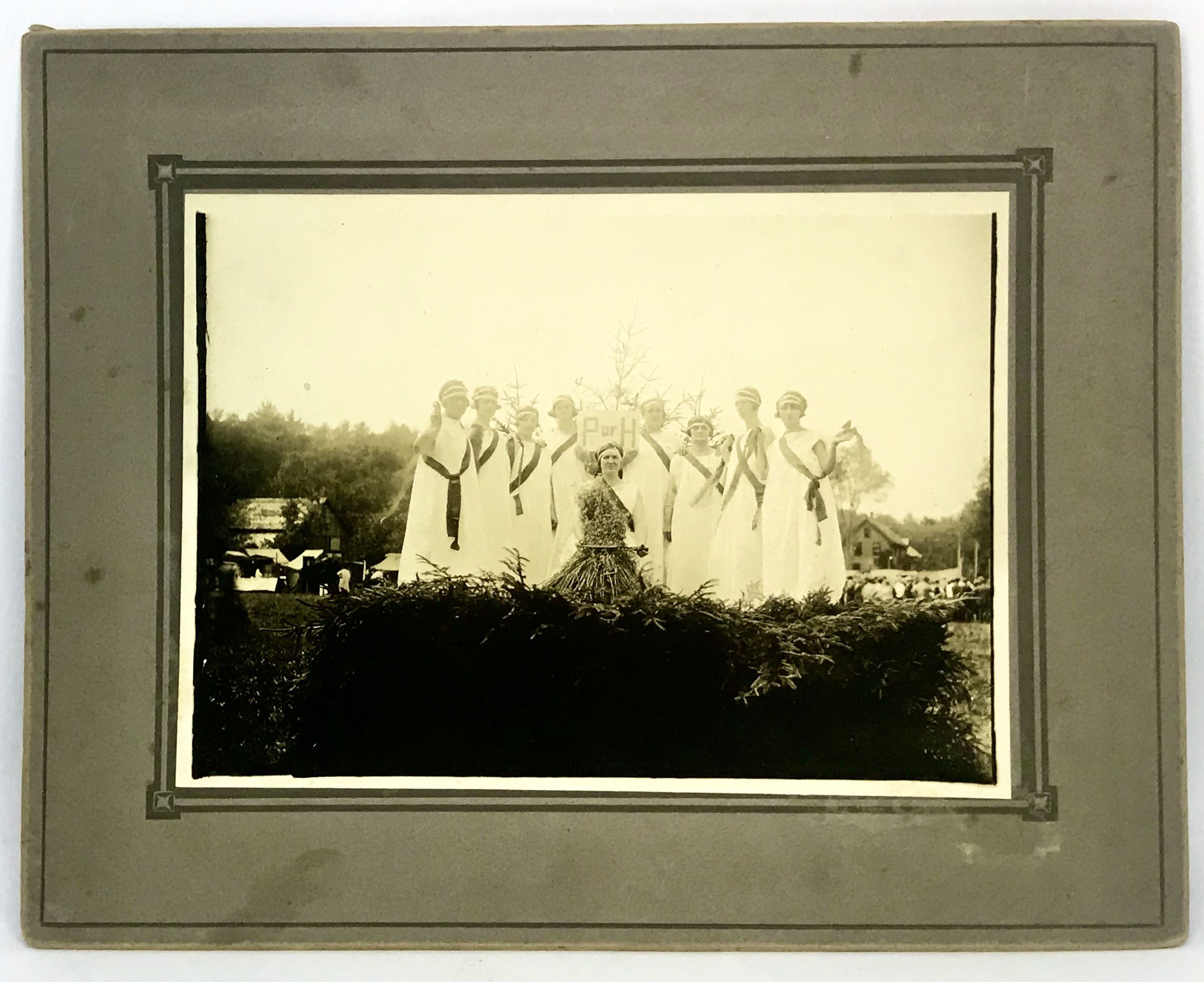 c. early 1920's. Gray cardboard mount with black and white photo. Very good. 25 x 12 cm. (photo 18 x 13 cm.) Black and white mounted photo of women attending a National Grange festival. Beginning in the late 1800's, the Grange, formally known as the Patrons of Husbandry, was organized to assist farmers with the multitude of difficulties they experienced, primarily in rural environments. The Grange, unlike many organizations, allowed women to become members. This photo depicts nine women in similar dress displaying the national symbol - a sheaf of wheat.
