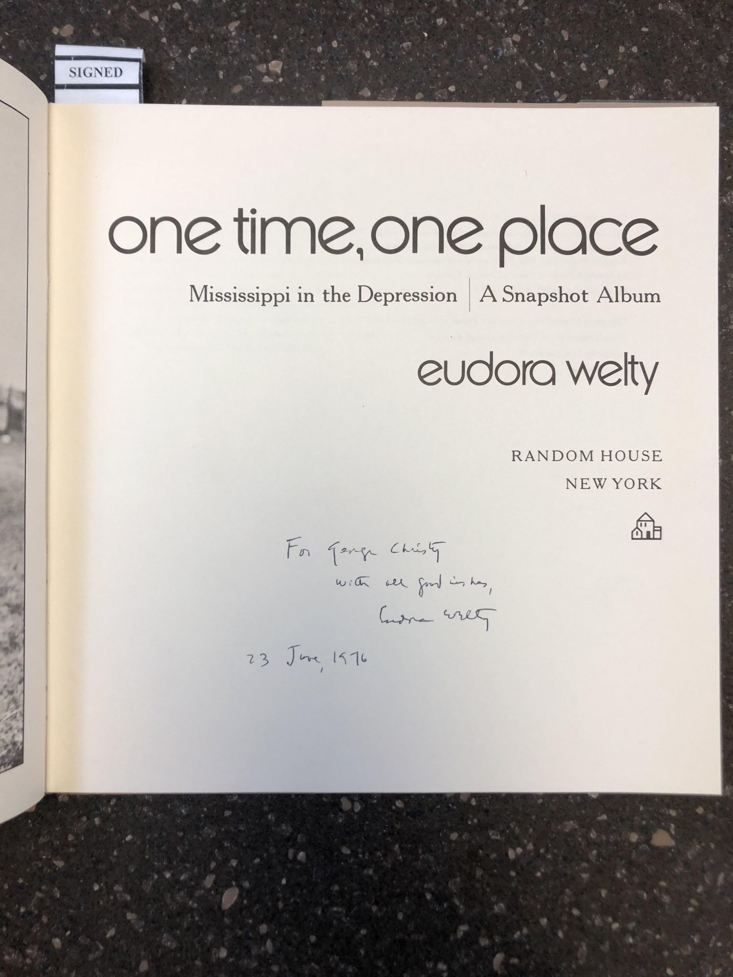 New York: Random House, 1971. First Edition. Hardcover. Oblong octavo, 111 pages; VG/VG-; spine olive green, with brown lettering; dust jacket protected with a mylar covering; mild shelf wear and soiling; fading to edges of jacket all around; fading to spine; price uncut '$7.95'; inscribed by Welty at title page; profusely illustrated with black and white photos; pages clean; shelved Case 11. 1347431. Shelved Dupont Bookstore.