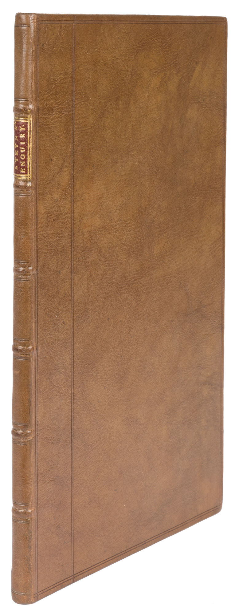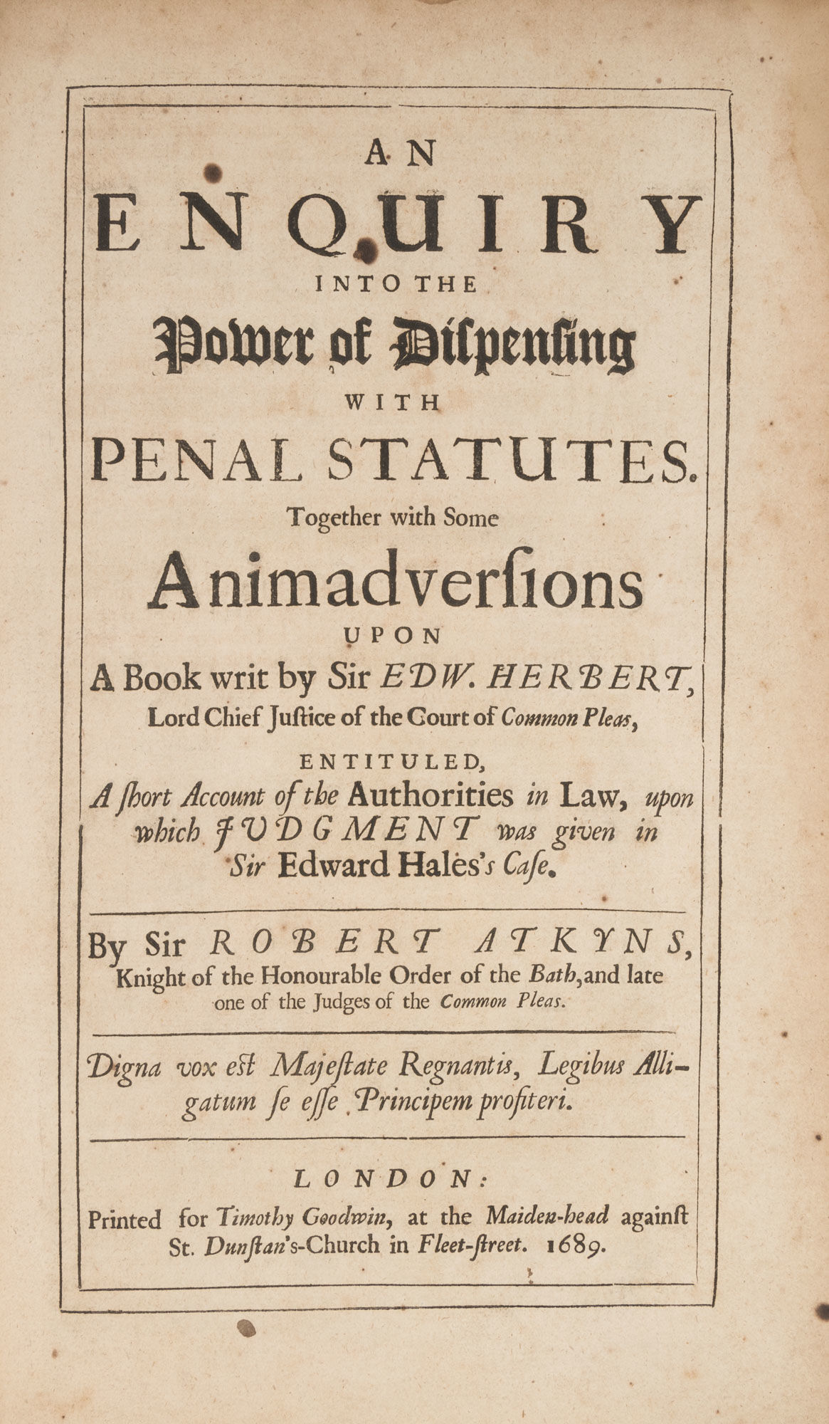 1689. London: Printed for Timothy Goodwin, 1689. 1st ed.. London: Printed for Timothy Goodwin, 1689. 1st ed. A Work Central to the Political Theory of the Glorious Revolution Atkyns, Sir Robert [1621-1710]. An Enquiry into the Power of Dispensing with Penal Statutes. Together with Some Animadversions upon A Book Writ by Sir Edw. Herbert, Lord Chief Justice of the Court of Common Pleas, Entituled, A Short Account of the Authorities in Law Upon Which Judgment Was Given in Sir Edward Hales's Case. London: Printed for Timothy Goodwin, 1689. [ii], 58 pp. Lacking initial leaf, a printer advertisement, and final leaf, a blank. Folio (11-1/4" x 7-1/2"; 28.6 x 19 cm). Superb period-style goatskin, blind rules to boards, raised bands, blind fillets and lettering piece to spine. Light browning and occasional light foxing to interior, negligible faint dampstaining to margins, underlining, annotations and tiny spark burns to a few leaves, light soiling to title page and verso of final leaf of text. An appealing copy in a notably handsome binding. $750. * First edition. A work central to the political theory of the Glorious Revolution, this essay refutes the Royalist claim that monarchs have the exclusive power to dispense with laws. Instead, it argues, this is a power shared equally with Parliament. A second edition was also published in 1689. English Short-Title Catalogue R22814.