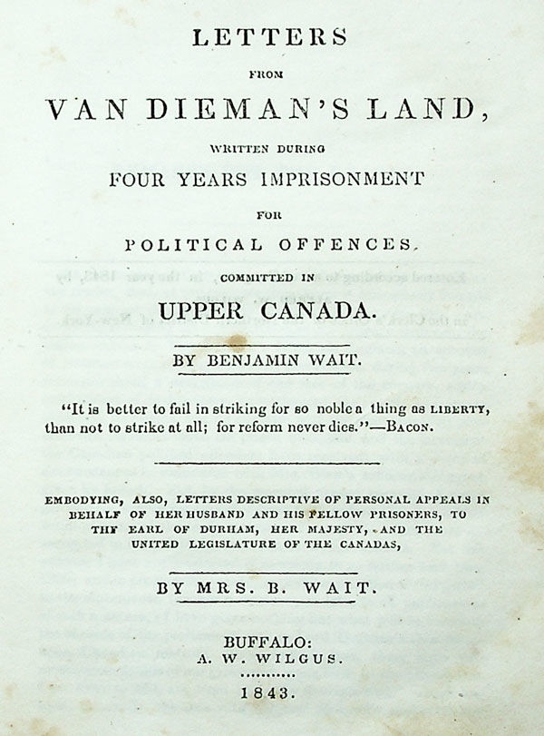 Benjamin Wait was exiled to Van Dieman's Land (i.e., Tasmania) for his participation in the Upper Canada Rebellion of 1837-1838. His wife Maria expended great efforts to free him, getting his original death sentence commuted to transportation and struggling to obtain a pardon for him, but she died shortly after his return to America. This volumes combines his narrative of his experience, taken from letters written to a friend, and an account of Maria's work on his behalf. FERGUSON 3762. HOWES W16. SABIN 100969. AMERICAN IMPRINTS 43-5096.