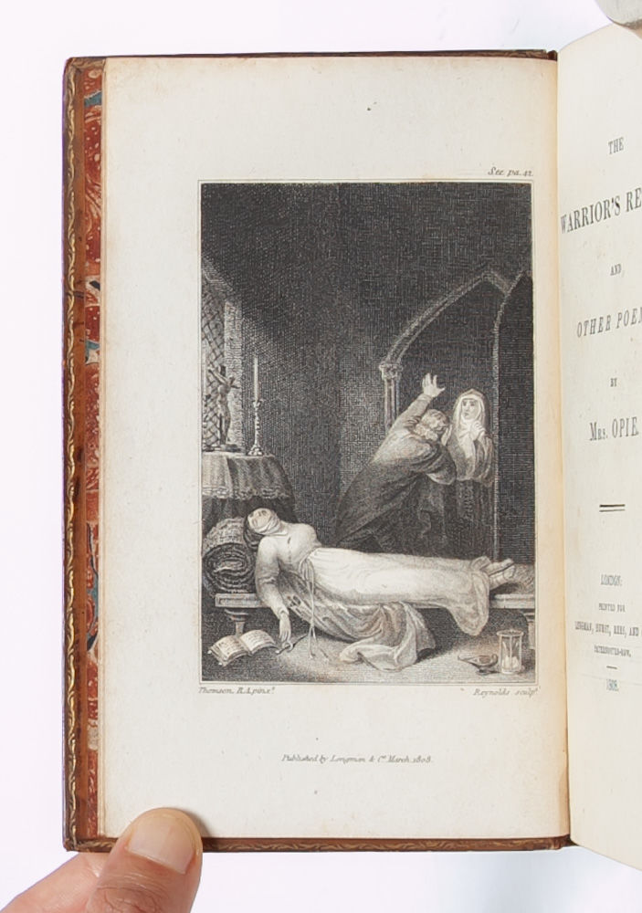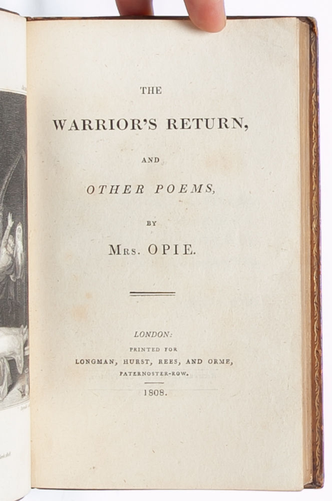 From the start of her literary career, Amelia Opie's work stood out for its fascination with philosophical gray areas. The blurring of gender, the pursuit of desire, and the experience of adventure earned her a reputation for "uniting manly wisdom [with] female gentleness and attractive manners" (Brightwell). Encouraged by her mother to transform fear of the unfamiliar into learning and activism, in her adulthood Opie joined the Godwin circle and collaborated with Mary Wollstonecraft and Sarah Siddons to use her work for social progress. One of her mature works, The Warrior's Return draws together an assortment of poetry that speak to current events in the world; and the title piece in particular participates in a wider poetic dialogue among women about war. Preceding Laetitia Barbauld's Eighteen Hundred and Eleven by four years, Opie "criticized the bloodiness of the wars with France, and the political vanity that had led Britian to enter unnecessary wars" (Saunders). Indeed, while she acknowledges that men in battle face sacrifice, it does not carry real meaning: "He fought like a hero! But VAINLY he fought." A bold move, Opie did provide herself with some protection. Shielding her piece with a thin "medieval screen, and the contemporary references obvious, it nevertheless provided a safeguard that the poem is a romance about the Crusades" (Saunders). Ultimately, "Opie's use of historical distance meant that...she avoided the response Barbauld endured four years later. In doing so, she set a precedent for literary descendants throughout the century. Other women turned to Opie's example in the post Eighteen Eleven backlash, using medievalism to question wars and women's political roles" (Saunders).