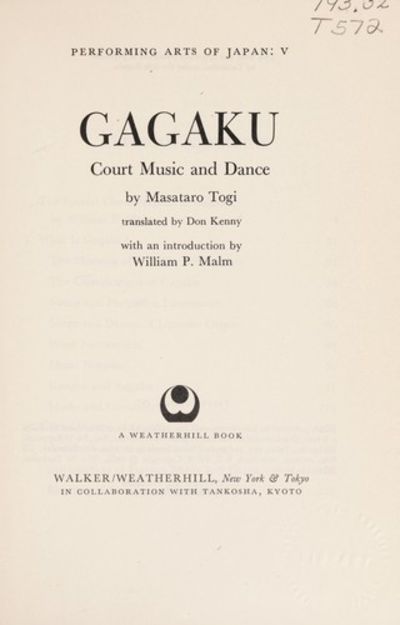Performing Arts of Japan: V Gagaku Court Music and Dance ... translated by Don Kenny with an introduction by William P. Malm