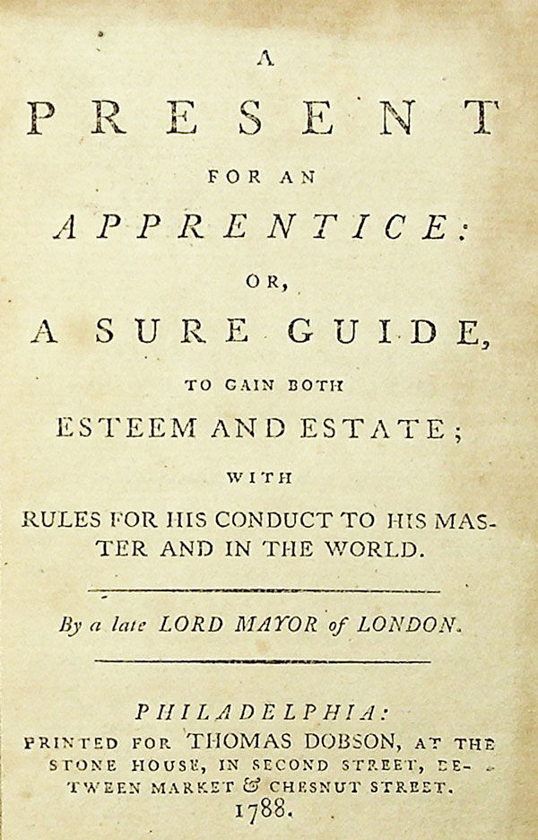 A compendium, intended for young apprentices and indentured servants, of "...practical hints on everyday subjects...imbued with strong Christian moralizing" (ODNB). Topics range through the moral, social, romantic, practical, and financial, including "Irresolution, and indolence," "Choice of a wife," "Servants," "Choice of friends," "Value of time," "Bonds and securities," "Horse-keeping," etc. This popular title went into numerous editions after its first appearance (London, 1740; first American edition printed by Benjamin Franklin in 1749). EVANS 20953. ESTC W28953 (8 copies).