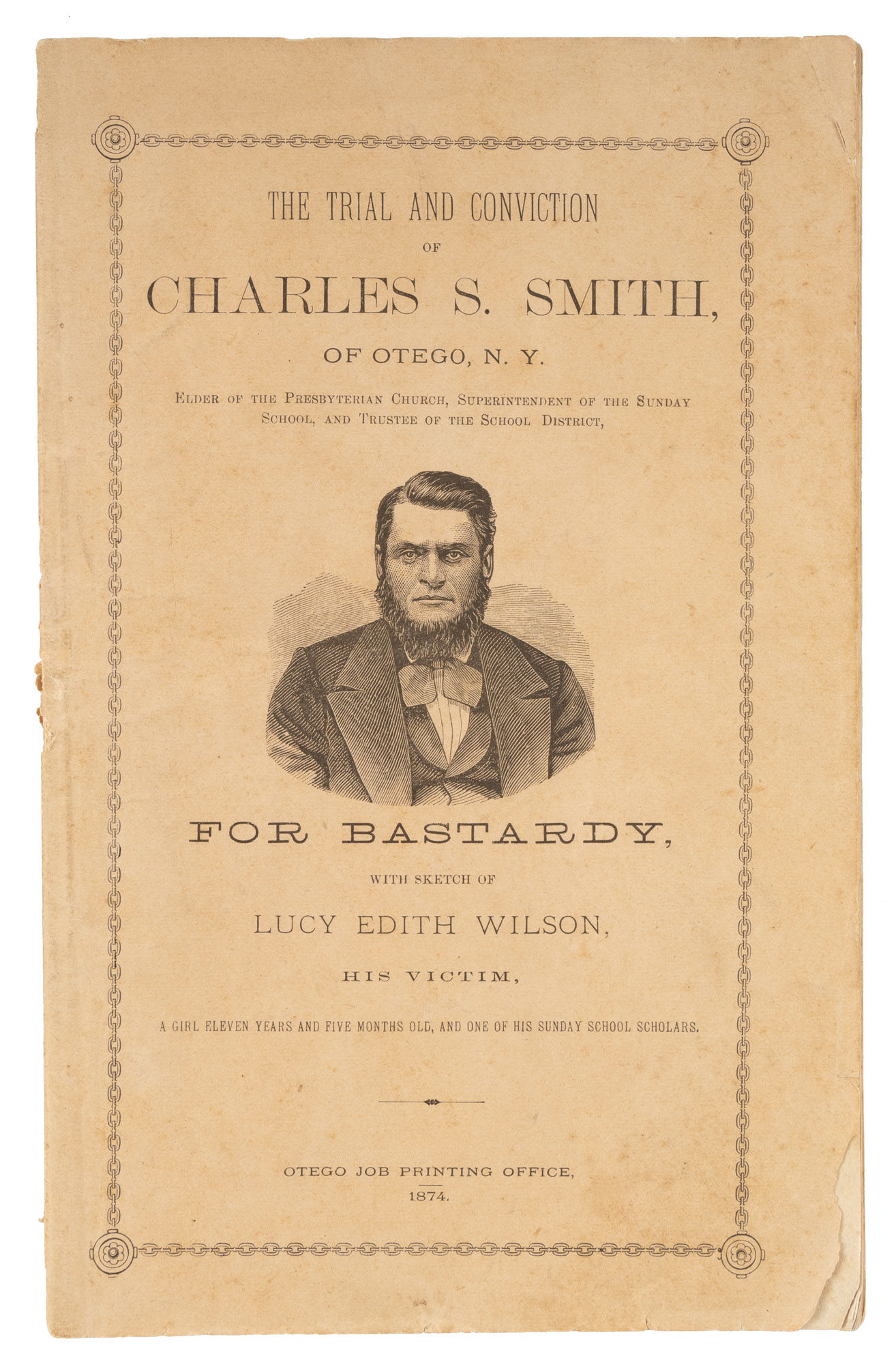 1874. Otego, N.Y.: Otego Job Printing, 1874.. Otego, N.Y.: Otego Job Printing, 1874. "Criminal Intercourse" in Otego, NY [Trial]. Smith, Charles S., Defendant. The Trial and Conviction of Charles S. Smith, Of Otego, N.Y., Elder of the Presbyterian Church, Superintendent of the Sunday School, And Trustee of the School District, For Bastardy, With Sketch of Lucy Edith Wilson, His Victim, A Girl Eleven Years and Five Months Old, And One of His Sunday School Scholars. Otego, NY: Otego Job Printing Office, 1874. 60 pp. Octavo (9" x 5-3/4"). Stab-stitched pamphlet in printed wrappers, portrait of Charles S. Smith to front wrapper and title page. Light soiling to wrappers, some chipping to extremities with loss to lower right front corner, small tear to back wrapper near spine. Light toning to interior, occasional light foxing, some small folds to corners. $650. * Only edition. Smith, a married Presbyterian elder, was put on trial in December 1873 for repeatedly raping and ultimately impregnating Edith Wilson, an eleven-year-old girl. Although the account is highly sympathetic to the victim, the assault, described as "criminal intercourse," was apparently less at issue than the bastardy. Edith swore an affidavit in November 1873 that she was pregnant by Charles Smith, "without means of support," and "likely to become a charge upon the town." Still pregnant, she testified against Smith in open court, a remarkable act of bravery and self-possession. The scandal rocked the small upstate New York town. Despite gossip that Edith's father had been involved and a certain degree of scapegoating by other witnesses, Smith was convicted of criminal bastardy on the strength of her testimony. Nothing is known about the aftermath of this remarkable trial. OCLC locates 8 copies, 3 in law libraries (Harvard, Social Law, University of Missouri).