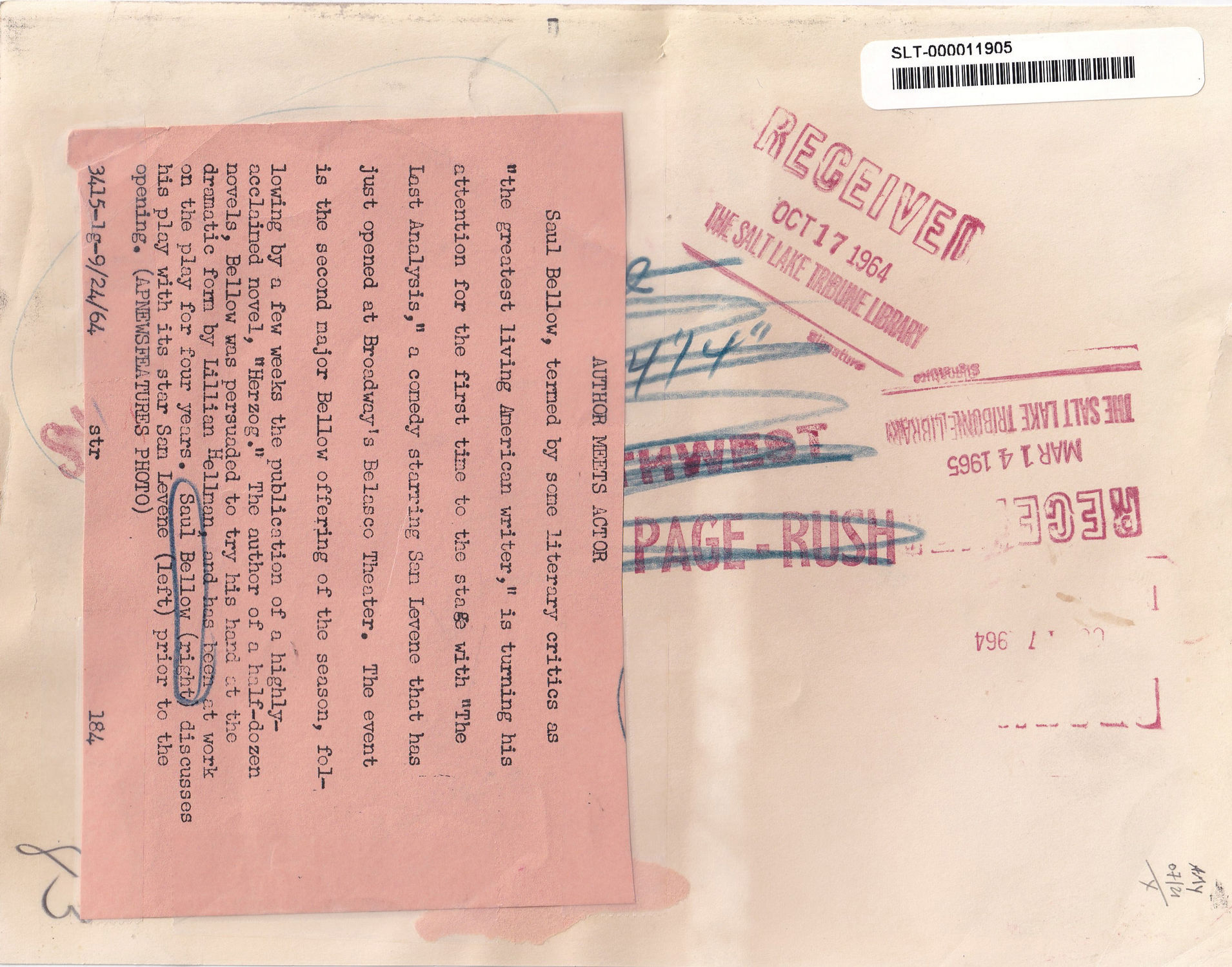 N.p.: N.p., 1964. Vintage reference photograph of playwright Saul Bellow and actor Sam Levene on the set of the 1964 play. Printed mimeo snipe with a full description affixed to the verso and noting a date of 9/24/64, along with the stamps of The Salt Lake Tribune Library.