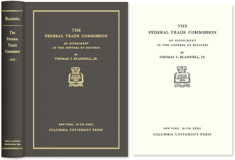 2008. ISBN-13: 9781584778653; ISBN-10: 1584778652. "Why Another 'Noble Experiment' Proved so Disappointing" Blaisdell Jr., Thomas C. The Federal Trade Commission. An Experiment in the Control of Business. Originally published: New York: Columbia University Press, [1932]. viii, 323 pp. Reprinted 2008 by The Lawbook Exchange, Ltd. ISBN-13: 9781584778653; ISBN-10: 1584778652. Hardcover. New. $80. * "This volume portrays in an interesting manner why another 'noble experiment' proved so disappointing. Dr. Blaisdell has appraised the Commission as a going concern during its career of some eighteen years. He has ably constructed a balance sheet of accomplishments and deficiencies and has assigned the reasons for its varying fortunes. The main theme pursued is the difference between the original purpose and actual achievement. (...) For those who are interested in the background and record of an experiment in the administrative control of the trust problem, this volume will prove of great value." : Benjamin S. Kirsh, Columbia Law Review 33 (1933) 193-194.