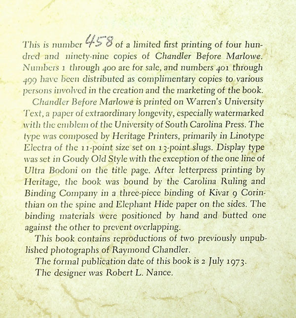 Columbia: University of South Carolina Press, [1973]. First, Limited Edition. Number 458 of 499 hand-numbered copies. Octavo (22cm); leather-backed boards in matching red leatherette slipcase and unprinted clear mylar jacket; 105pp. Fine in Near Fine slipcase.