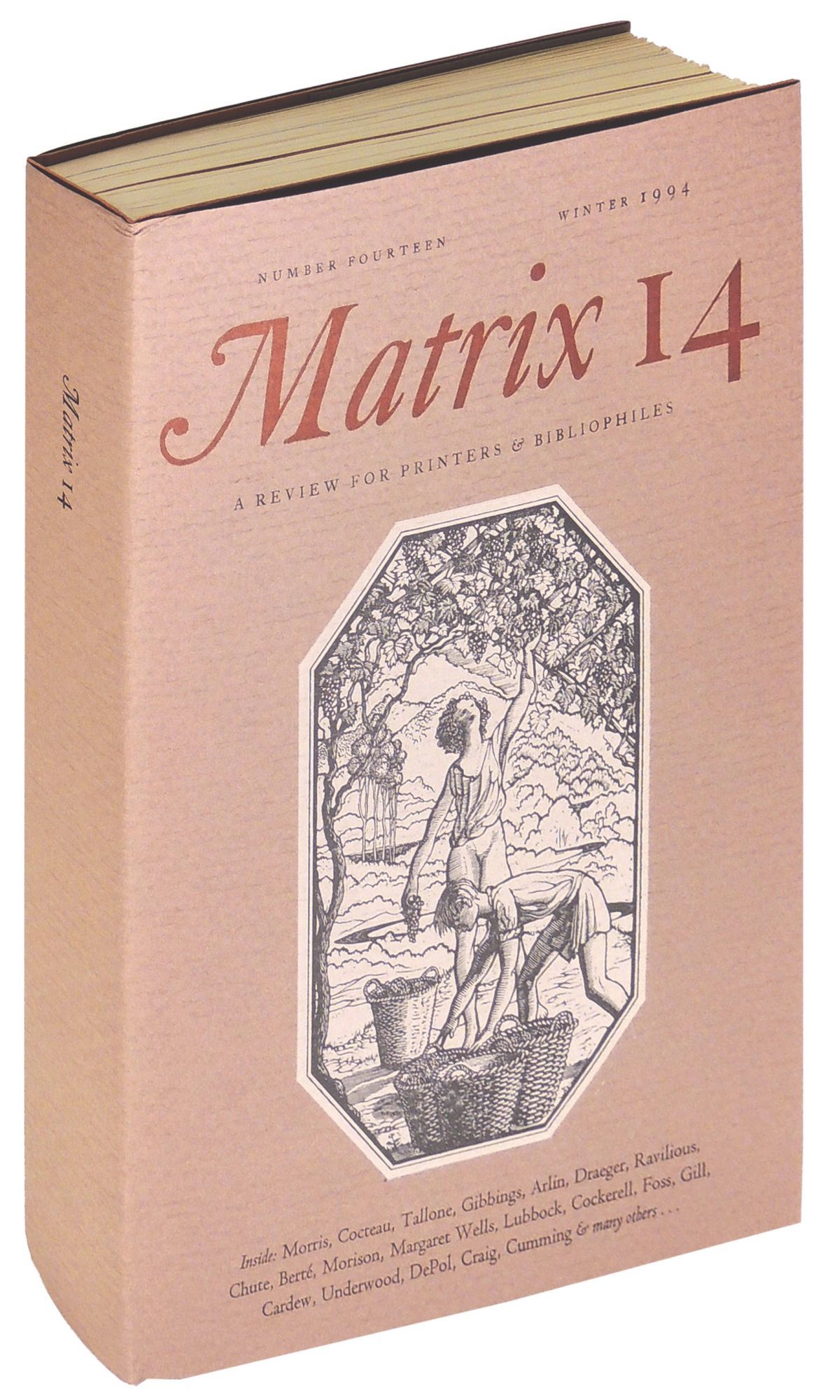 Risbury, England: Whittington Press, 1994. Hardcover. Fine. Hardcover. One of 880 copies of the regular edition. There were also 95 copies in the deluxe edition. The annual publication of Matrix was one of the foremost publications on the book arts during its 36 year existence. Sadly, Matrix 36, published in 2020, was the last annual edition of the Matrix series. After 36 years, Whittington Press owners, John and Rose Randle, decided to discontinue producing this fine annual for printers and bibliophiles on the book arts that compiled articles, illustrations, paper and typography samples and book reviews. This issue includes a number of articles by such well-known bibliophiles as Ruari McLean, John Dreyfus, Sebastian Carter, David Butcher, William Peterson, and Roderick Cave. Interspersed throughout are photographs, printing samples, and illustrations. Bound in light mauve stiff paper covers. Letterpress printed in Caslon and Cochin types and printed on Sommerville Laid and Zerkall mould-made papers. In fine condition. Measures 8 x 11 inches. BOB/102621.
