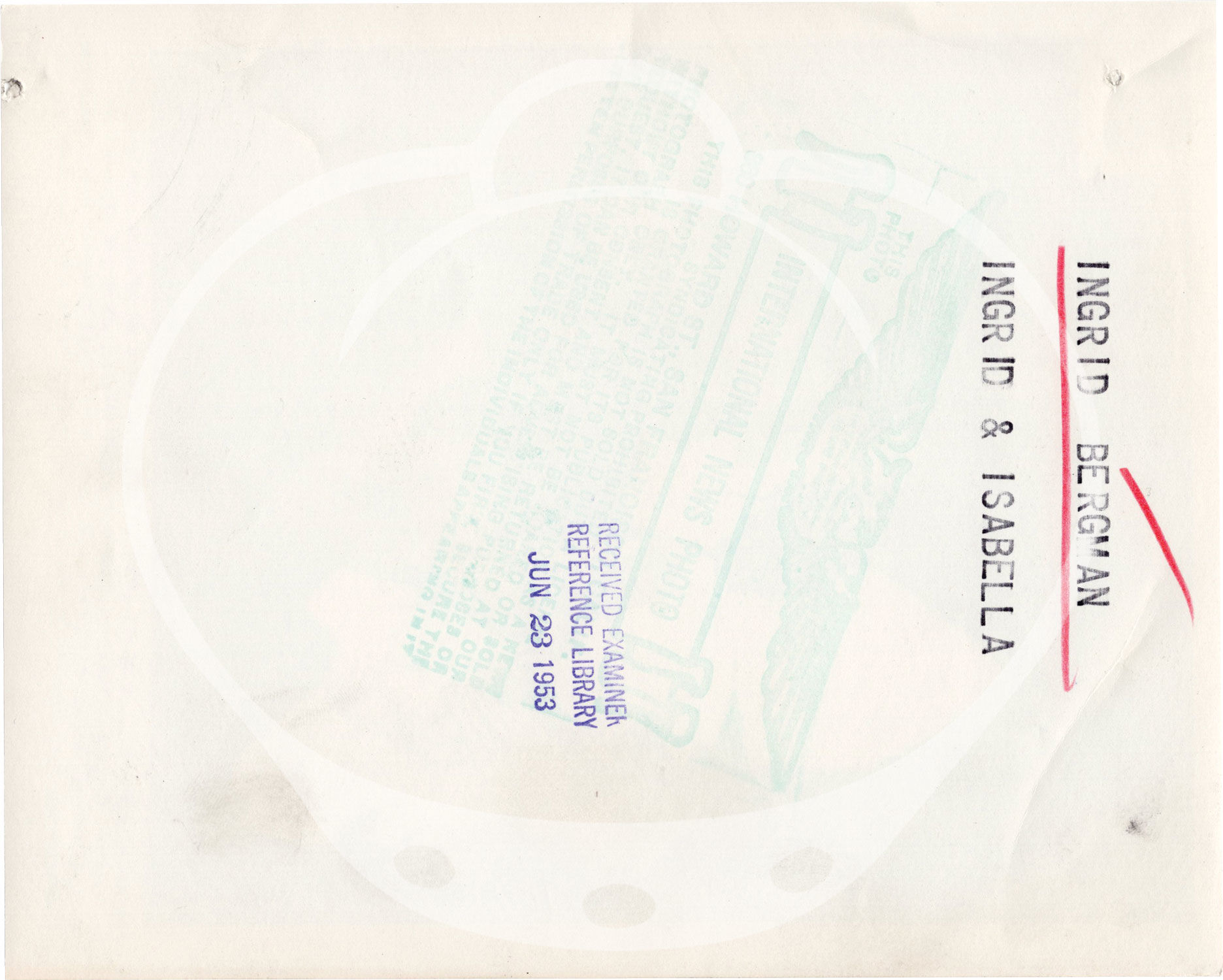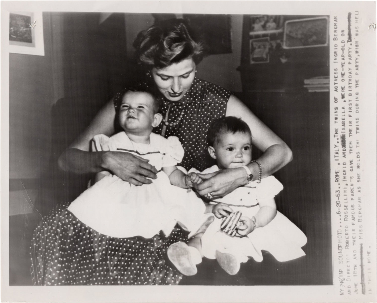 New York: International News Photos, 1953. Vintage press soundphoto (wire photo) of Ingrid Bergman holding her one year old twins, Isabella and Ingrid, celebrating their first birthday on June 18, 1953, at Bergman and Roberto Rossellini's home. Soundphoto dated 6-20-53. "Ingrid Bergman Ingrid & Isabella" stamp, faint "International News Photo" stamp, and "Jun 23 1953" "Received Examiner Reference Library" stamp on verso.