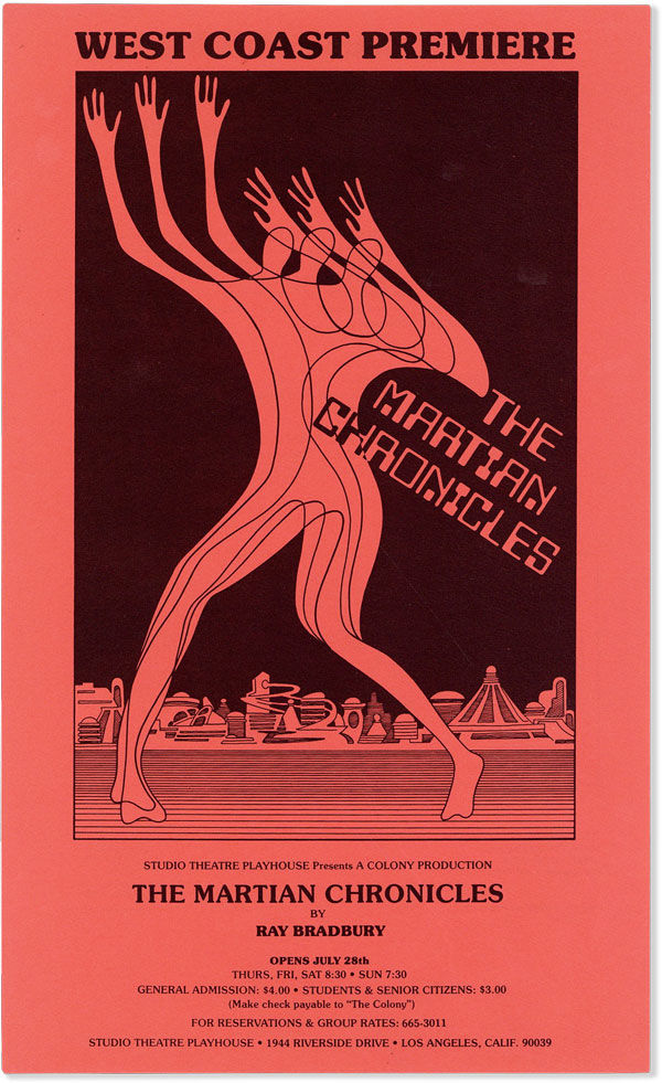 Los Angeles: Studio Theatre Playhouse, [1977]. First Edition. Original double-sided poster, with text and illustrations offset printed in black on red stock, measuring 21.5cm x 35.75cm (8.5" x 14"). Mild handling, two small abrasions on verso; Near Fine. Attractive promotional poster for the west coast premiere of Bradbury's Martian Chronicles, which opened July 28, 1977 at the Studio Theatre Playhouse in Los Angeles. Recto features a large uncredited illustration, with verso printing a synopsis, a quote by Bradbury, and a map of the area surrounding the venue.
