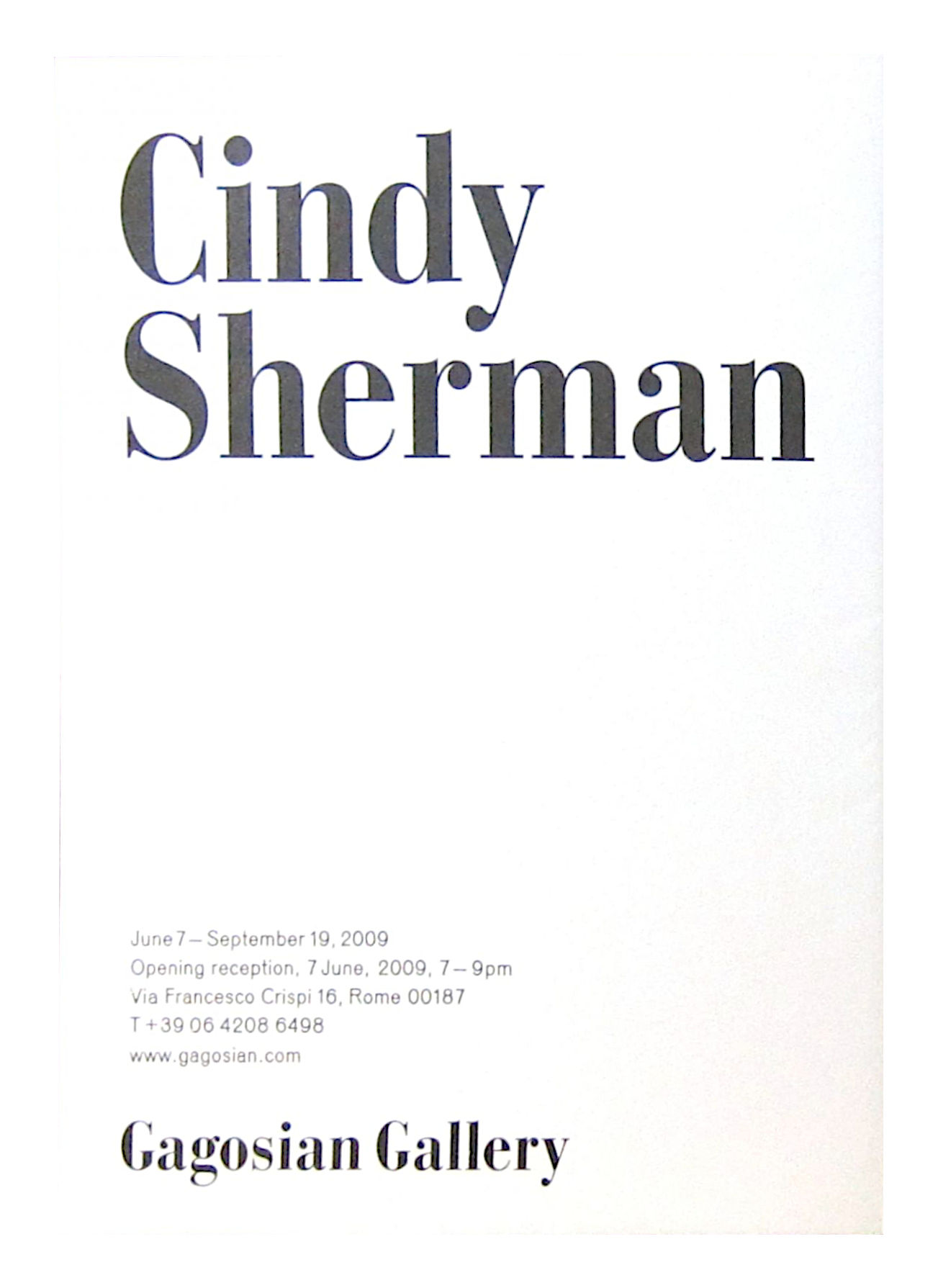 This brochure/poster constitutes the catalog for the Cindy Sherman show held at the Gagosian Gallery in Rome 7 June to 19 September 2009.