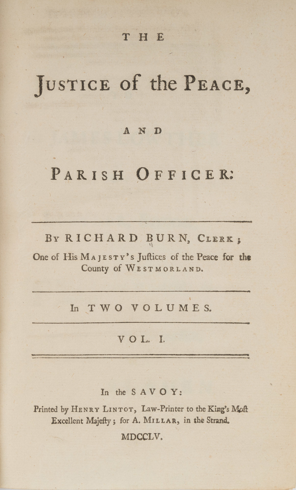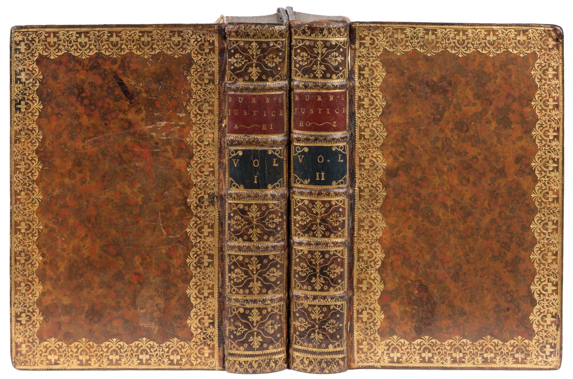 1755. 2 vols. 1st ed, London, 1755. 2 vols. 1st ed, London, 1755. Notably Handsome First Edition of the Most Popular Work Ever Written on Justices of the Peace Burn, Richard [1709-1785]. The Justice of the Peace, And Parish Officer. [London]: Printed by Henry Lintot, 1755. Two volumes. xxvii, [1], 541, [3]; [iii], 573, [11] pp. Three-page publisher advertisement at end of Volume I, another one-page advertisement facing title page of Volume II. Octavo (8-1/4" x 5"). Contemporary sprinkled calf, gilt frames and large gilt fillets to boards, gilt spines with raised bands and lettering pieces, gilt tooling to board edges, all edges of text blocks gilt, gilt inside dentelles, marbled endpapers. A few minor nicks and scuffs to boards, light rubbing to extremities, corners bumped, front board of Volume I just beginning to separate but secure, rear joint of Volume I and rear joints of Volume II starting, armorial bookplate of Hugh Cecil Lowther, 5th Earl of Lonsdale to front pastedowns. Moderate toning to text, light foxing to a few leaves, early hand-lettered location mark to versos of front free endpapers. A notably handsome set. $1,500. * First edition. A durable work, Burn's Justice went through 30 editions by 1869 and was excerpted often in early American justice manuals, such as Parker's Conductor Generalis (1764) and Burn's Abridgment of Burn's Justice of the Peace and Parish Officer (1773). It covers such topics as Accessory, Alehouses, Aliens, Assault and Battery, Bail (By Writ of Habeas Corpus), Bankrupt, Bastards, Burglary, Clergy, Dogs, Evidence, Excise and Customs, Forgery, Game, Homicide, Jurors, Libel, Oaths, Insolvent Debtors, Polygamy, Promissory Notes, Rape, Riot, Robbery, Taxes and Vagrants. Holdsworth notes that "a perusal of these headings tells us something of the development of the system of local government" during the time of the book's publication. Lowther [1857-1944] was an English soldier, sportsman and founder of the Dumb Friends League, now the Blue Cross, an important English animal welfare society. Holdsworth, A History of English Law X:162. English Short-Title Catalogue T68627.