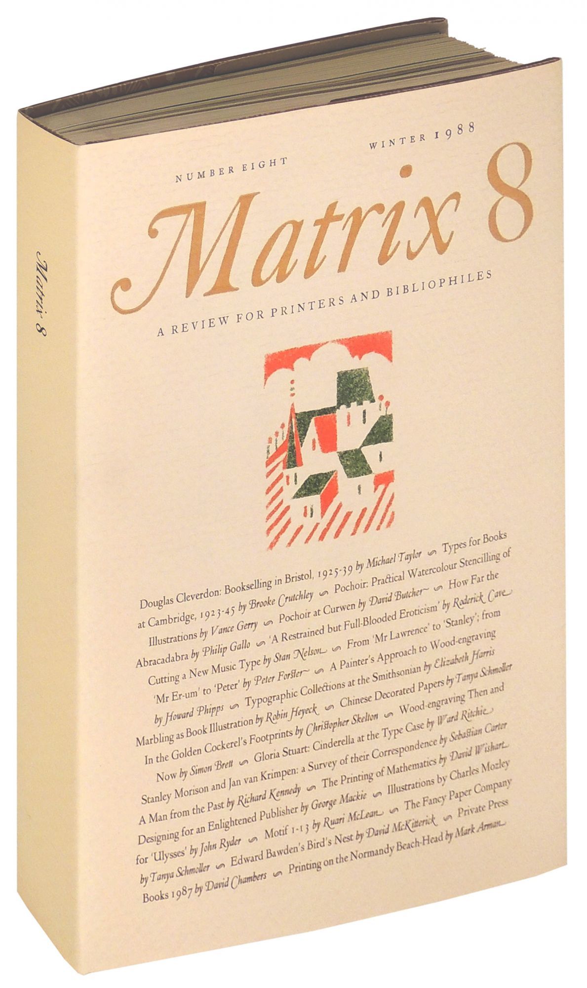 Risbury, England: Whittington Press, 1988. Hardcover. Fine. Hardcover. One of 800 copies of the regular edition. There were also 100 copies of the deluxe edition. The annual editions of Matrix were some of the foremost publications on the book arts during its 36 year existence. Sadly, Matrix 36, published in 2020, was the last annual edition of the Matrix series. After 36 years, Whittington Press owners, John and Rose Randle, decided to discontinue producing this fine annual for printers and bibliophiles on the book arts that compiled articles, illustrations, paper and typography samples and book reviews. This issue includes a number of articles by such well-known bibliophiles and book artists as David Butcher, Stan Nelson, Simon Brett, Ward Ritchie, Sebastian Carter, and Roderick Cave. Interspersed throughout are photographs, printing samples, and illustrations. Bound in beige stiff paper covers. Letterpress printed in Monotype Caslon and printed on Sommerville Laid and Zerkall papers. In fine condition. Measures 8 x 11 inches. BOB/102821.