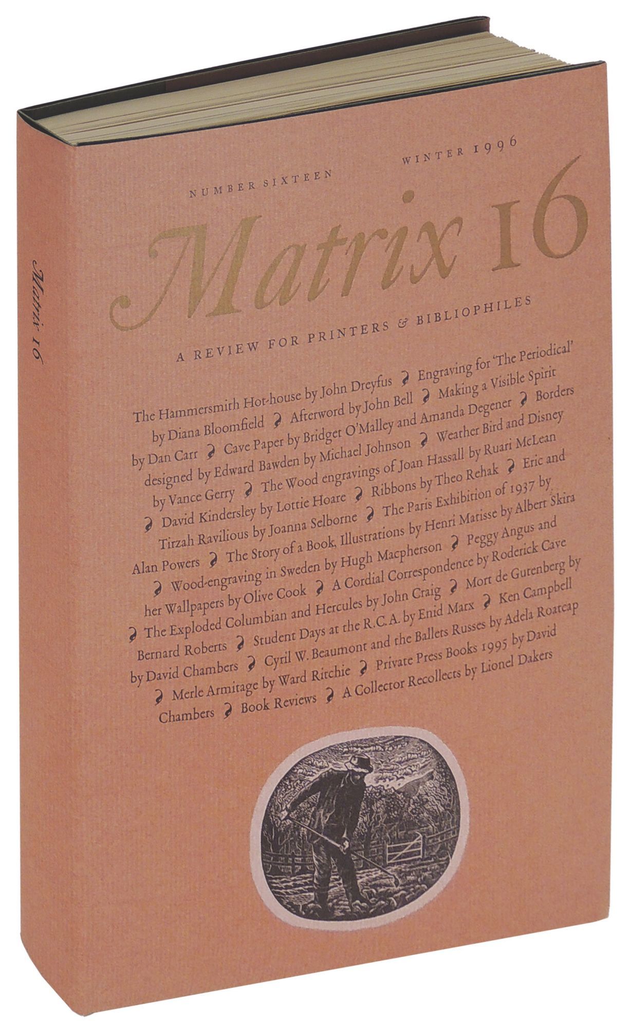 Risbury, England: Whittington Press, 1996. Hardcover. Fine. Hardcover. One of 830 copies of the regular edition. There were also 95 copies in the deluxe edition. The annual editions of Matrix were some of the foremost publications on the book arts during its 36 year existence. Sadly, Matrix 36, published in 2020, was the last annual edition of the Matrix series. After 36 years, Whittington Press owners, John and Rose Randle, decided to discontinue producing this fine annual for printers and bibliophiles on the book arts that compiled articles, illustrations, paper and typography samples and book reviews. This issue includes a number of articles by such well-known bibliophiles and book artists as Ward Ritchie, Ruari McLean, John Dreyfus, Enid Marx, and Roderick Cave. Interspersed throughout are photographs, printing samples, and illustrations. Bound in reddish brown stiff paper covers. Letterpress printed in Caslon, Romulus, Cochin, and Regulus types and printed on Sommerville Laid, Hahnemühle, and Zerkall Halbmatt papers. In fine condition. Measures 8 x 11 inches. BOB/102821.