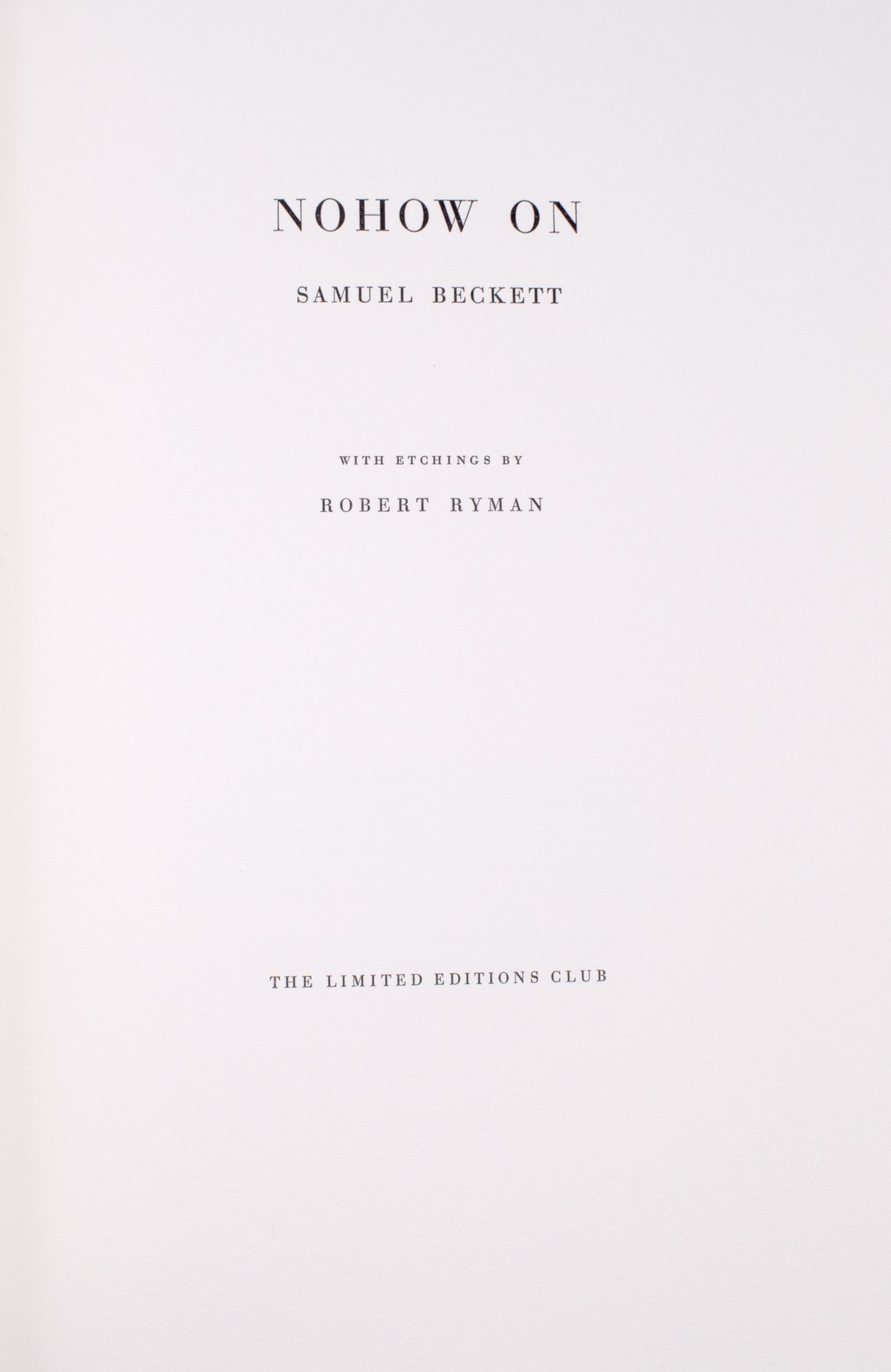 New York: The Limited Editions Club, 1989. Edition limited to 550 numbered copies signed by Beckett and Ryman. Illustrated with 6 original aquatint etchings by Robert Ryman. 4to. Original full black morocco, clamshell case. Ryman, Robert. Edition limited to 550 numbered copies signed by Beckett and Ryman. Illustrated with 6 original aquatint etchings by Robert Ryman. 4to.