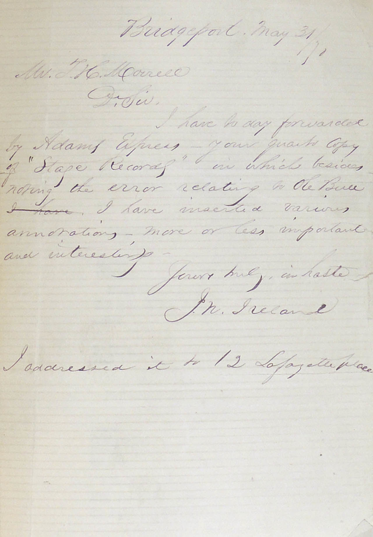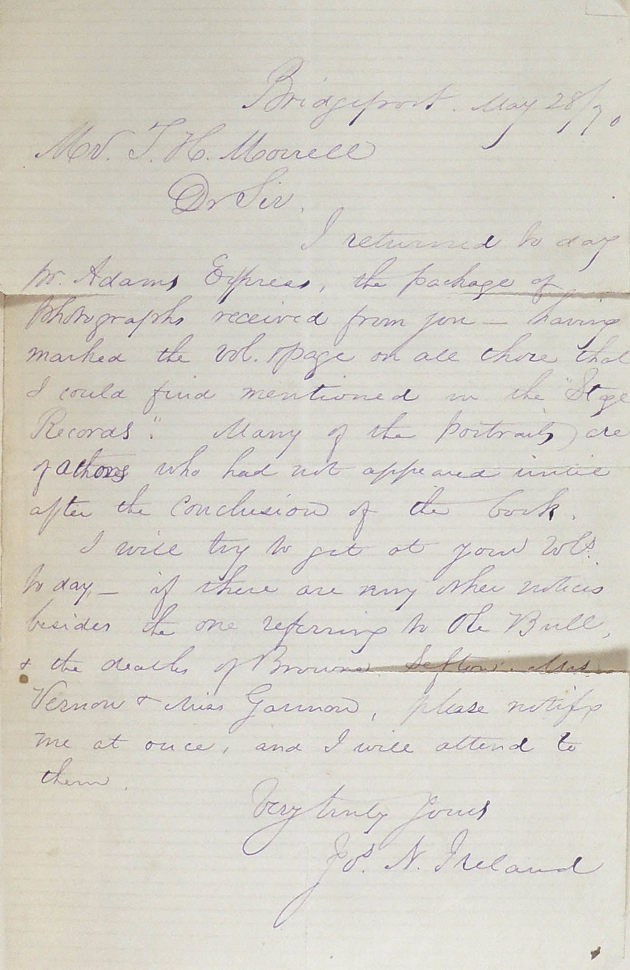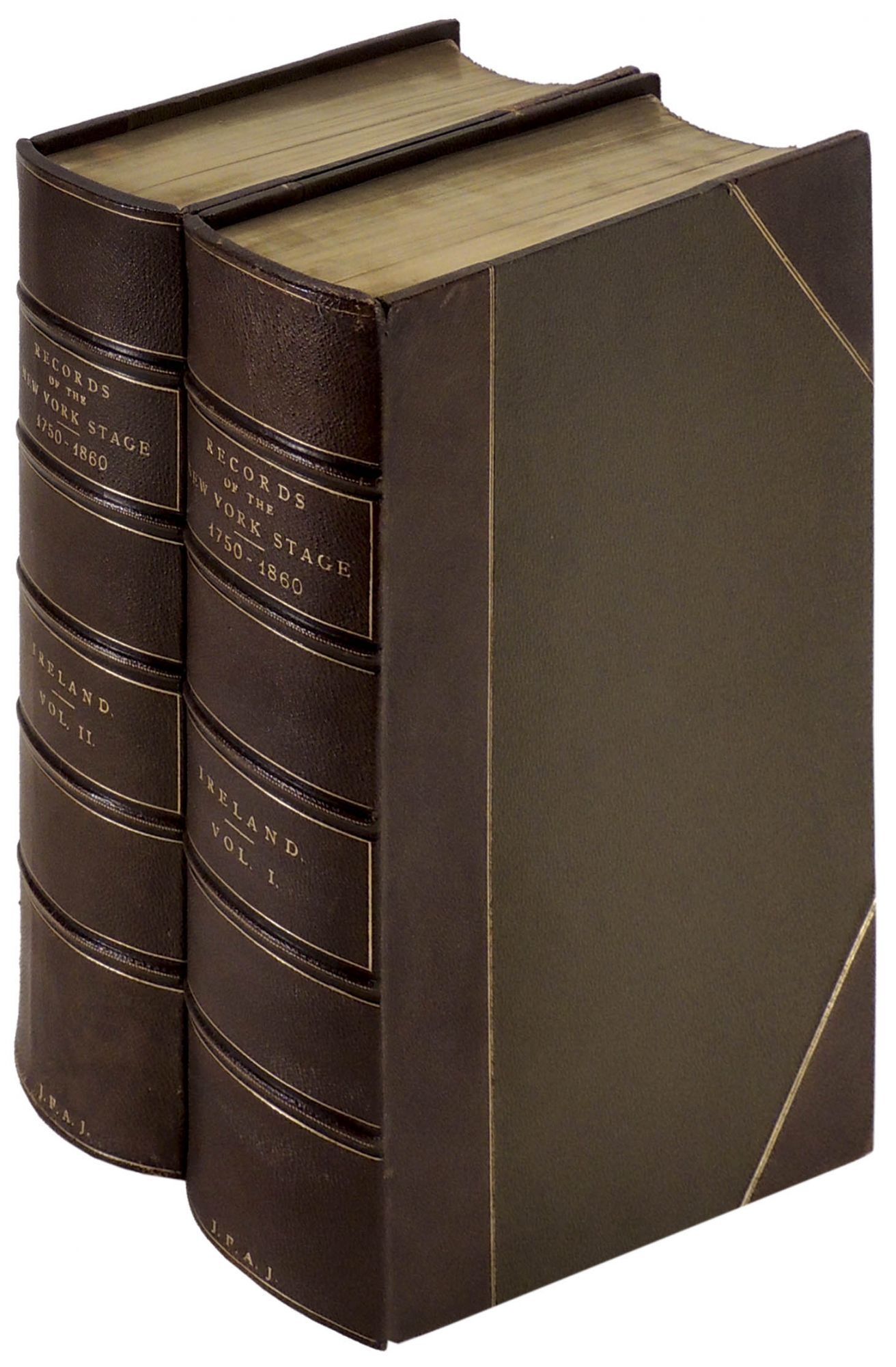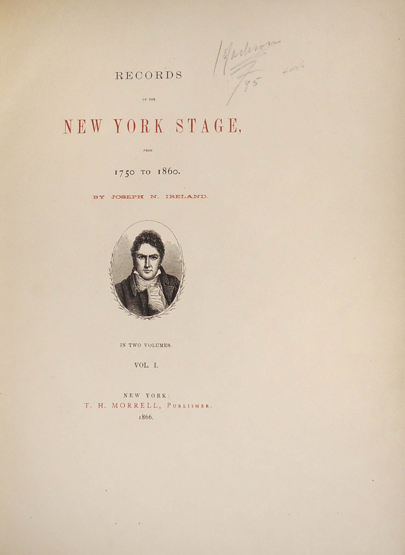 This is a monumental history of New York City theatre by Joseph Ireland (1817-1898). Joseph Norton Ireland, one of the major early historians of the American theater, entered his father's business after graduating from high school in his native New York. Leaving the company in 1855 and retiring to Bridgeport, Connecticut, Ireland devoted the rest of his life to studying and writing about the stage. His history is organized chronologically by theatre season and then by theatre. It compiles a prodigious amount of information about every performance at the major New York theatres, its dates and its cast. He writes about how well the performances and the actors and actresses were received. In addition, Ireland offers detailed personal and professional information about the performers and other important theatrical figures of the time. His comments are entertaining as well as enlightening. He also provides interesting details about the exterior and interior appearance of the important theatres of the time. Ireland's occasional annotations to the text in Morrell's copies appear to be to update information about various performers for later editions of the book. Many are about the deaths of actors that occurred after the book was published. Others offer a more detailed biography, news of a marital separation, or a date correction.