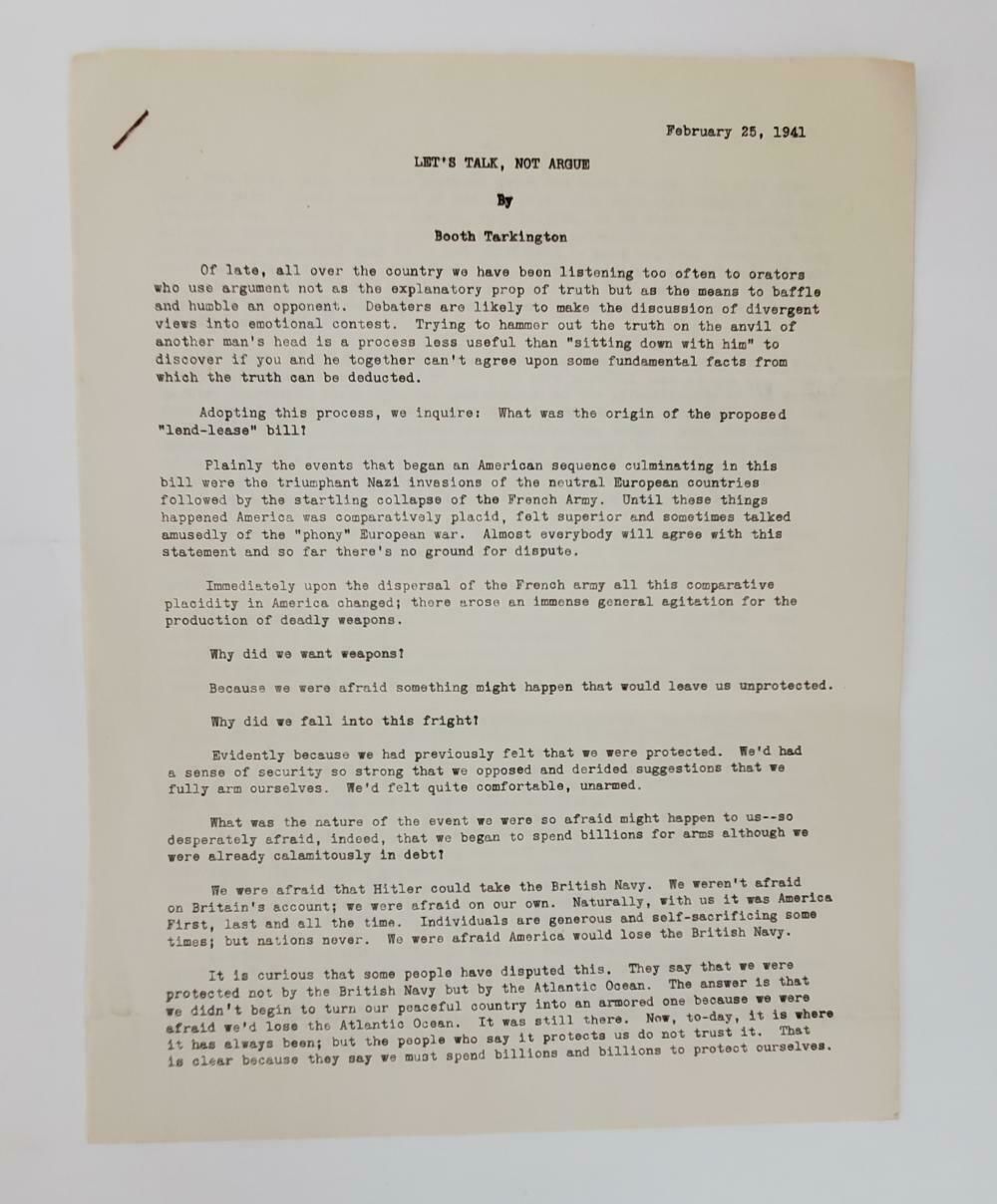 2) ”Let’s Talk, Not Argue,” by Booth Tarkington. Multigraphed on three sheets of white wove paper, 8.5” x 11”, printed on one side only, stapled at upper left corner, 25 February 1941. First edition, scarce. Russo and Sullivan p. 139. An article urging nonpartisan support of President Roosevelt against Hitler, written for the Indiana Committee for National Defense. It appeared in “The Indianapolis Star,” February 27, 1941, and was published in “‘The Congressional Record’, Appendix, January 3-March 14, in extension of remarks of Hon. Joseph F. Guffey in the United States Senate, p. A 933.” Very good; folds, staple rusted, pages slightly age-toned. From the papers of Tarkington’s friend and amanuensis, Elizabeth Trotter.