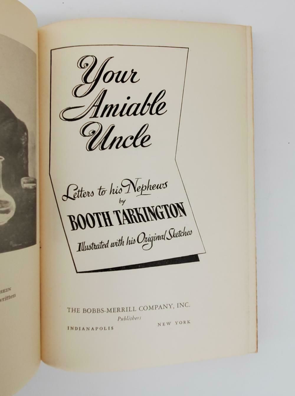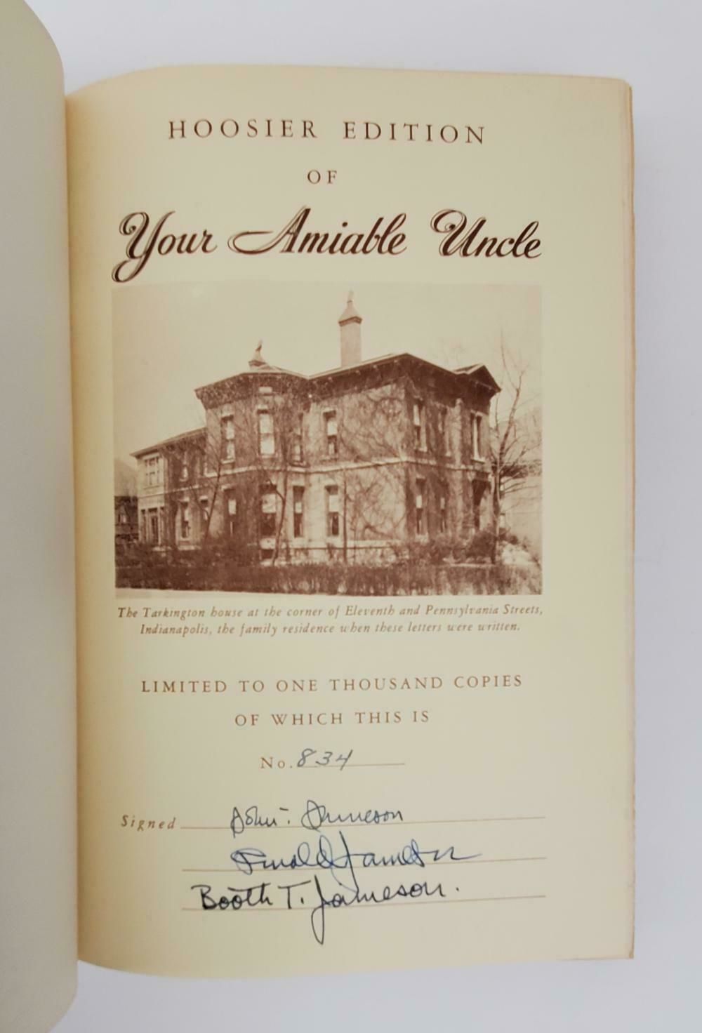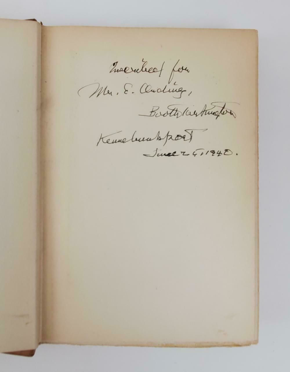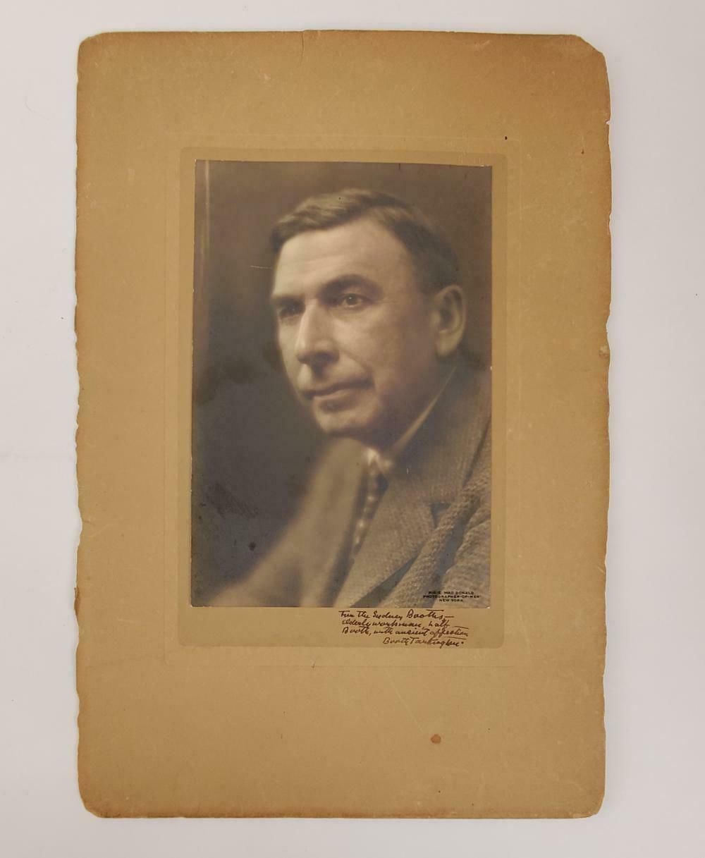 3) An original photograph of Tarkington, taken c. 1940 and mounted on heavy card. The inscription reads “The Sydney Booths-- / Elderly workman, half / Booth, with ancient affection / Booth Tarkington.” With the photography studio’s information in the lower right corner of the photograph; a list of awards won by the studio printed on the verso. Very good. Photograph shows a few minor smudges and nicks. Board chipped at edges with a long closed tear at top margin. Both photograph and board are age-toned.