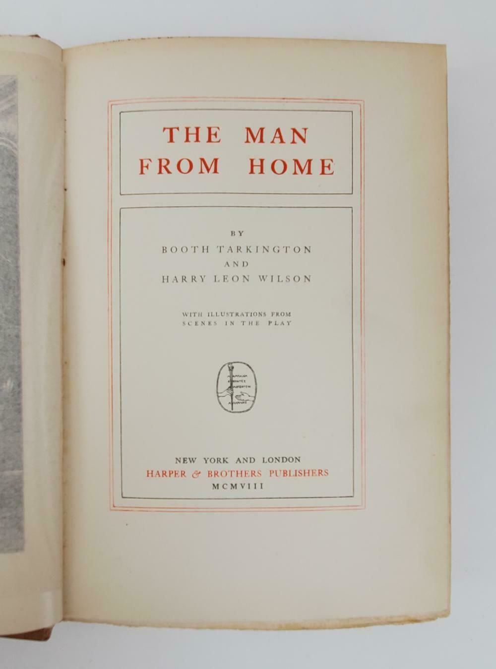 Description: Booth Tarkington and Harry Leon Wilson. The Man from Home. New York and London: Harper and Brothers, 1908. Illustrated with black and white photographs. Inscribed by Booth Tarkington, dated 1940. Included with the volume is a clipped signature of William Hodge, a stage actor to whom Tarkington dedicated this book. Very good. Light rubbing to edges and corners of boards, head and tail of spine. Text block lightly age-toned.