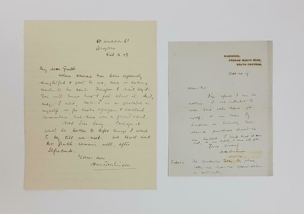 Two ALSs by H.M. Tomlinson. In one, dated October 31, 1929, Tomlinson regrets that he cannot provide his correspondent with copies of one of his works. In the other, dated October 12, 1923 and addressed to “My dear Grubb,” Tomlinson thanks Grubb for his kindness. Very good. Both lightly age-toned; the later letter has some foxing and discoloration around the heading, which has transferred across the fold. Both creased from mailing.
