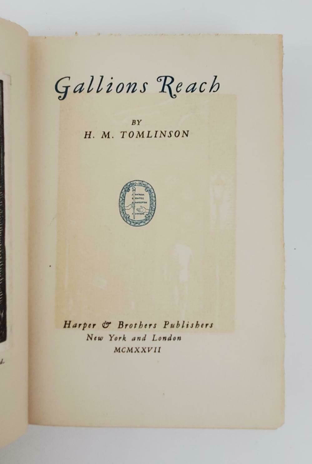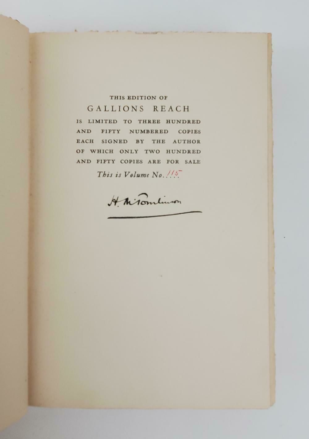 H.M. Tomlinson. Gallions Reach. New York and London: Harper and Brothers, 1927. Pages uncut. Limited edition, #115/350; signed by author on limitations page. Frontispiece and three additional illustrations. Very good+ with good only slipcase. Slipcase cracked at multiple edges and corners; edges much rubbed. Some damage to paper label on side of case. Light rubbing at corners of boards; text block lightly age-toned. Book protected with mylar cover.