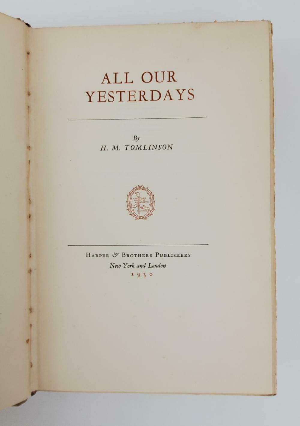 H.M. Tomlinson. All Our Yesterdays. New York and London: Harper and Publishers, 1930. First Edition. Limited Edition, No. 223 of 328. Octavo, 445 pages. Bound in blue with gray titling on brown spine. Deckle edge with pages uncut. Numbered and signed by author to dedication page. An eight-page facsimile of a foreword reproduced from the author’s manuscript and written specially for this limited edition is bound in this copy.