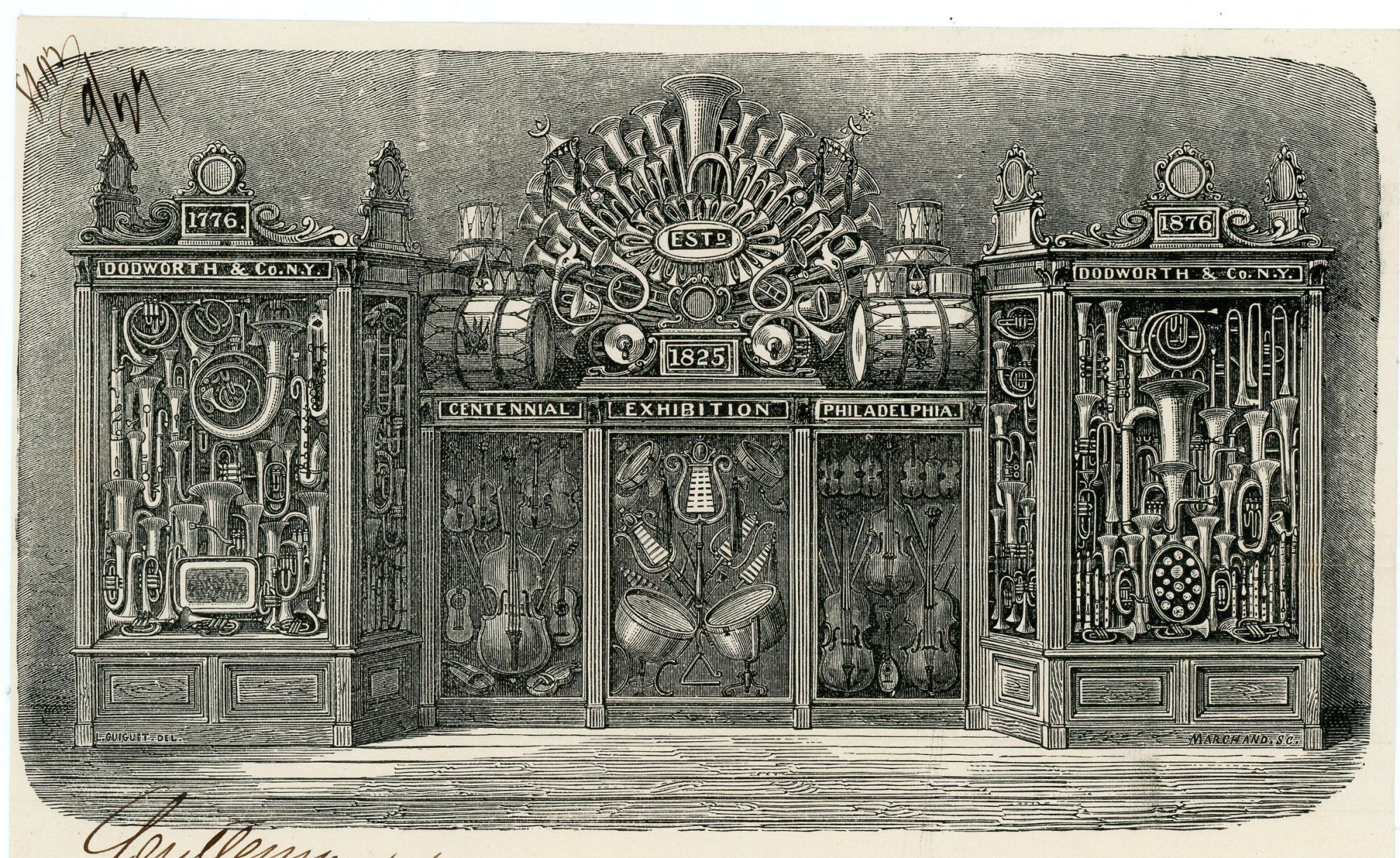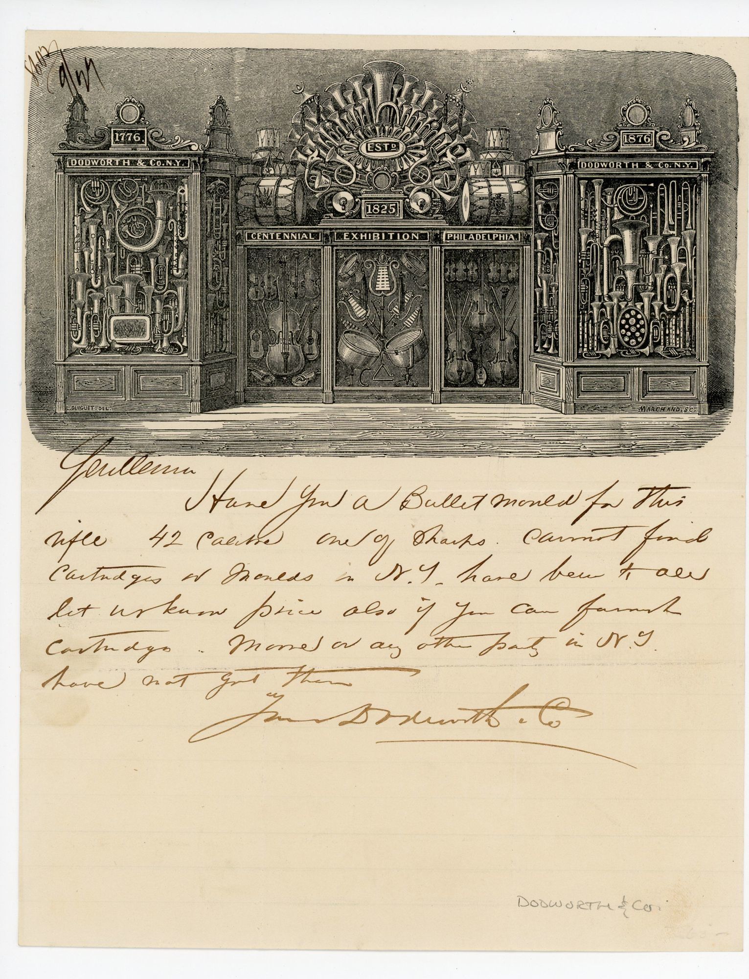 1876. Letterfolds.. A 10" x 8" letterhead for Dodworth & Co. New York, makers and retailers of musical instruments. The top half of the page is a lithograph of an engraving L. Guiguet Del., March & S.C. depicting the company's display as seen at the 1876 Philadelphia Centennial Exposition. The content is unrelated to the image. Reverse is blank. Excellent depiction on an interior exhibit at the Centennial World's Fair.