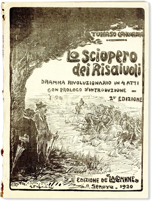 Extremely uncommon anarchist drama, set among a community of striking rice-workers in rural Italy. Tomaso Concordia (dates uncertain; active ca 1910-1950) is described by Massimo Ortalli as a "shoemaker from Vercelli," among the group of "militant autodidacts" who did much to develop Italian proletarian social drama in the 1910s and 20s (see Rivista Anarchica, anno 34, n.298, Apr 2004). Concordia also penned a drama on the death of Francisco Ferrer (Il Martirio di Francesco Ferrer, 1947) and a number of popular and theoretical works on anarchism. This title catalogued but not located in OCLC, though we note five locations in Italy, including several for the first edition (Biella: 1911).