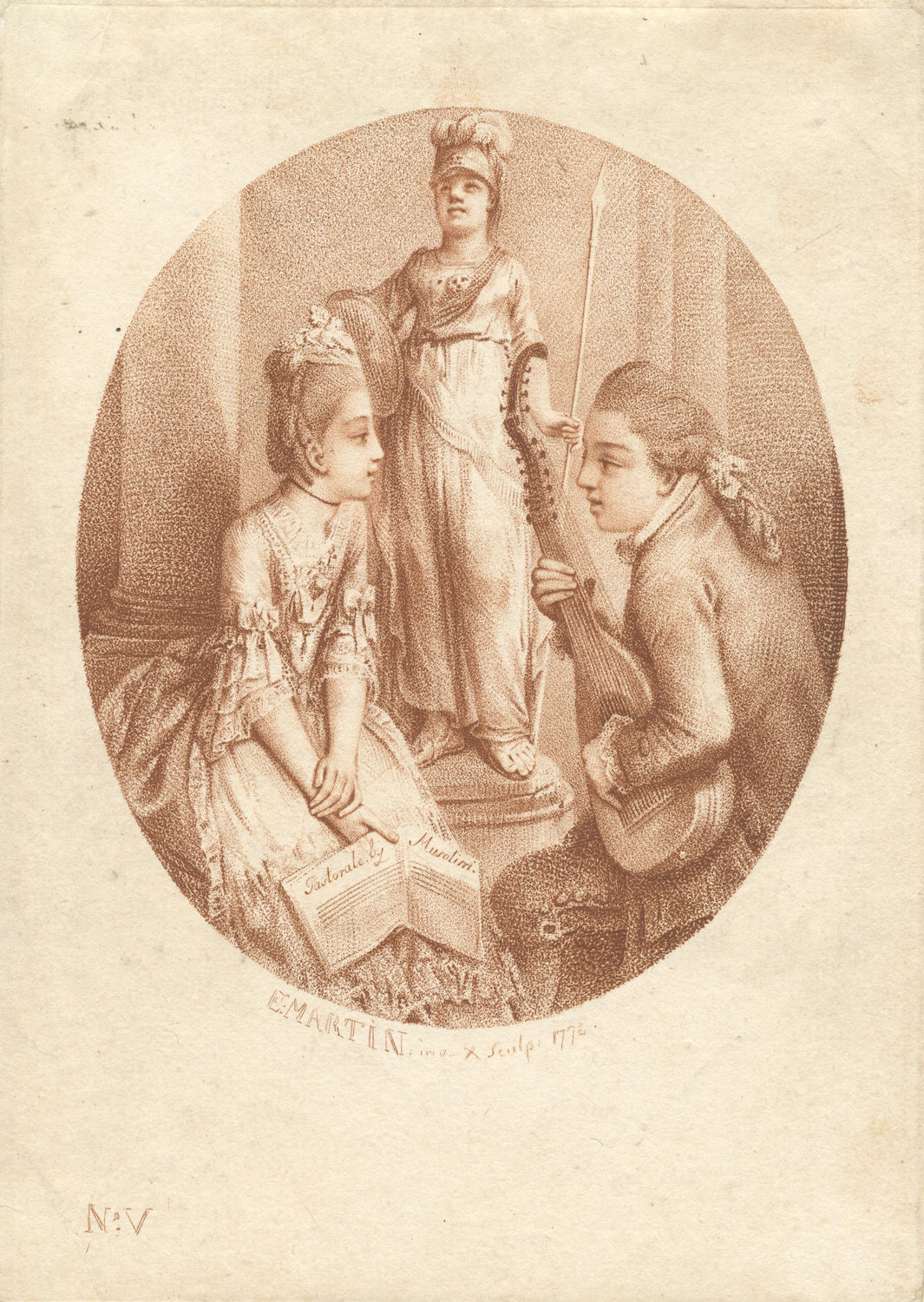 Oval stipple engraving printed in sepia depicting a singer and mandolinist with a statue of Athena in the background