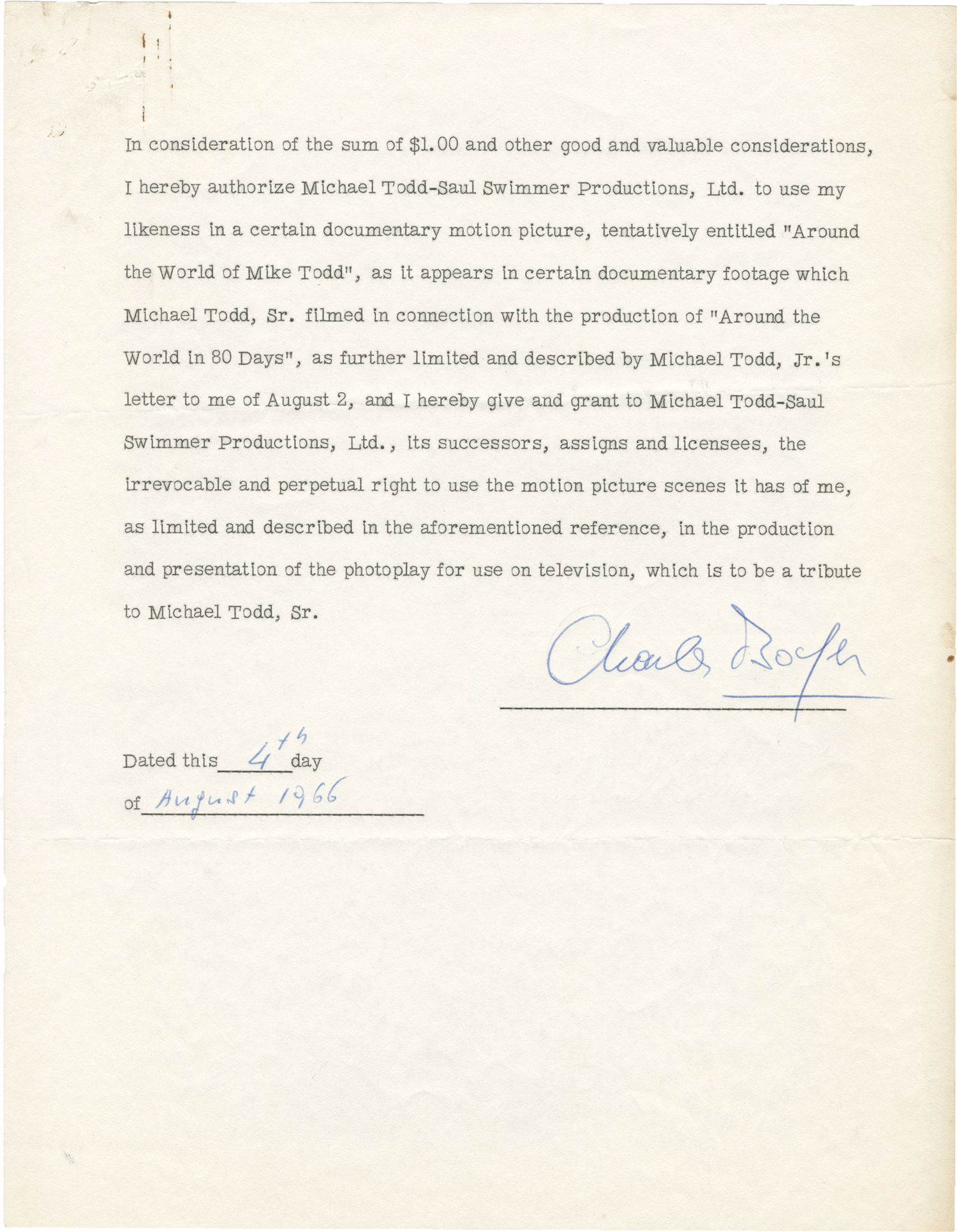 N.p.: N.p., 1966. Typed letter from producer Michael Todd Jr. to actor Charles Boyer, dated August 2, 1966, regarding Todd's 1967 television documentary film "Around the World of Mike Todd," and production contract SIGNED by Boyer, dated August 4, 1966.