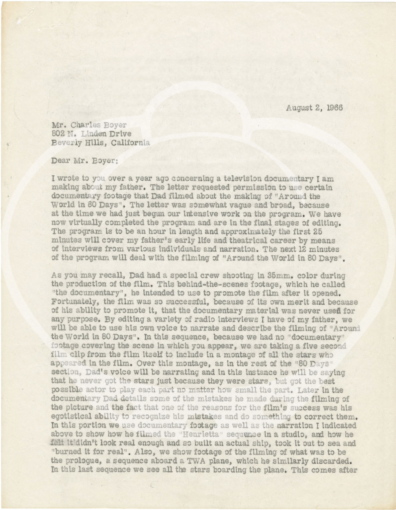 Todd's letter addresses his wish to use behind-the-scenes footage of Boyer shot during the production of "Around the World in Eighty Days" (1956), and describes his plans for the documentary. Enclosed with the letter is an additional copy of the contract, not signed by Boyer, along with a copy of a previous letter from Todd to Boyer dated April 20, 1965.