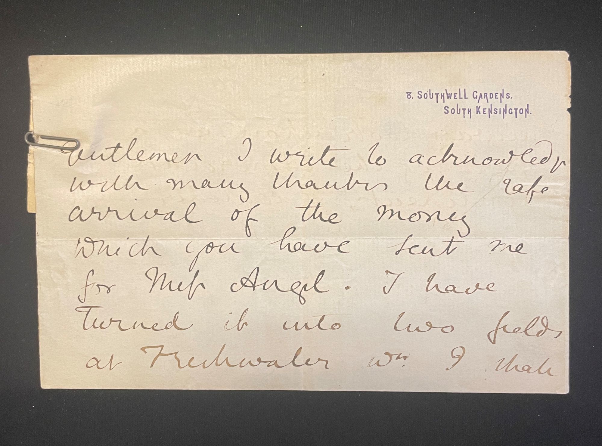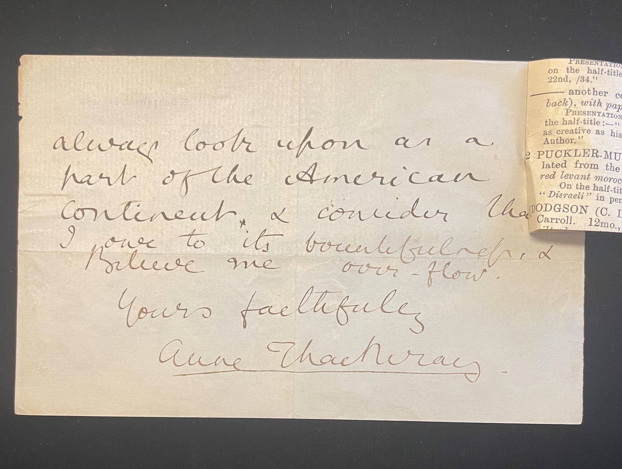1875. No Binding. Near Fine. Undated note, (circa 1875) two sided, on polished sheet approx 7x4.5" from author Anne Thackeray, daughter of the famous William Makepeace Tackeray, with embossed letterhead with her address in South Kensington, London "8 Southwell Gardens, South Kensington Gentleman I write to acknowledge/ with many thanks the safe/ arrival of the money/ which you have sent me for My Angel. I have / turned it into two fields / at Freshwater wh(ich) I shall/ always look upon as a / part of the American continent (and) consider that / I owe to its bountifulness/ Believe me overflow./ Yours faithfully." Miss Thackeray enthusiastically thanks presumably American buyers for their purchase from her of presumably American rights to publish her first novel "Miss Angel", published in England in 1875. The proceeds she writes financed purchase of land in Freshwater, a village on the western end of the Isle of Wright. Besides being the birthplace of physicist Robert Hooke, during Thackeray's lifetime it was the home of poet laureate Alfred Lord Tennyson. Photographer Julia Margaret Cameron had a home there from 1860-1875. Indeed it was Cameron who brought Anne Thackeray to Freshwater. According to letters at Eton College, Anne Thackeray and Minny, one her four younger sisters, became "especially intimate with Alfred and Emily Tennyson after the sudden death of their father at the end of 1863. Julia Margaret Cameron was directly instrumental in this, by bringing them across to the Isle of Wight and putting them up in one of her Freshwater cottages, but Anne Thackeray suggests that it was their desire for reassurance and familiarity which made the presence of the poet especially attractive: 'It seemed to us that perhaps there more than anywhere else we might find some gleam of the light of our home, with the friend who had known him and belonged to his life and whom he trusted . and as we rested aimlessly in the twilight, we seemed aware of a tall figure standing in the window, wrapped in a heavy cloak, with a broad-brimmed hat. This was Tennyson, who had walked down to see us in silent sympathy.'1 It remained important for Anne and her younger sister Minny to detect something of the reality of their father memorialised in his friends, who would now become their friends. The story of the developing relationship between the Thackeray girls and the Tennyson family emerges in a variety of surviving sources, but nowhere more compellingly than in the family letters given by Anne's granddaughter to Eton College Library." (Source: John Alpin. Tennyson Research Bulletin; Lincoln Vol. 8, Iss. 4, Nov 2005). Anne Isabella Thackeray Ritchie (1837 - 1919) was eldest daughter of William Makepeace Thackeray whose several novels made her a central figure on the late Victorian literary scene. She is noted especially as the custodian of her father's literary legacy, and for short fiction that places fairy tale narratives in a Victorian milieu. Her 1885 novel Mrs. Dymond introduced into English the proverb, "Give a man a fish and you feed him for a day; teach a man to fish and you feed him for life." (Source: Wikipedia) In 1863, Anne Isabella published The Story of Elizabeth with immediate success. Other works followed and her first novel, of five, My Angel was published in 1875. Her second novel, published in 1877 "From an Island" is semi-autobiographical and could have been based in part on her life in Freshwater. Provenance; The heirs of the library of Sherman and Anne Lyon Haight, major American bibliophiles whose Dickens and Cruikshank collections are with Trinity College in Hartford CT. Paper-clipped to the note is a description excised from a book catalog for Cruikshank's "The Loving Ballad of Lord Bateman