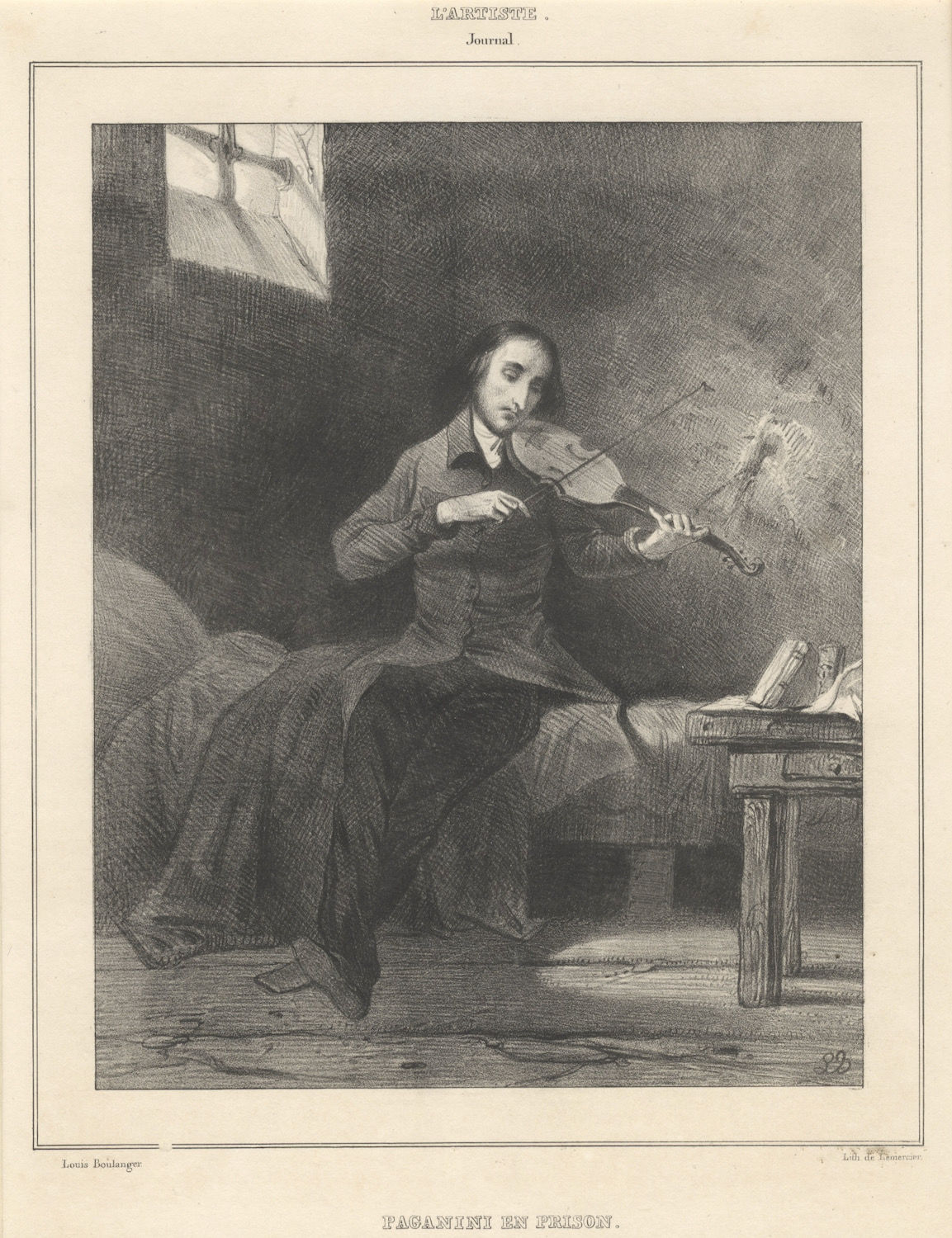 Paganini en Prison. Original lithograph, signed in the stone with the artist's initial's "LB." Printed by Lemercier and published in the journal "L'Artiste.