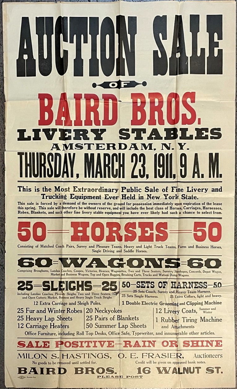 Amsterdam, NY: Recorder Print, 1911. Letter folds with few intact separations.. A 38" x 24 1/2" broadside promoting an Public Sale of Fine Livery and Trucking Equipment. Printed in black with red accent. Includes 50 Horses - Matched Coach Pairs, Surrey and Pleasure Teams, Farm and Business Horses, Saddle Horses and many others. 60 Wagons including Broughams, Landau Coaches, Victorias, Hearses, Surreys, Stanhopes, Top and Open Buggies and many others. 25 Sleighs, 50 Sets of Harnesses. An array of blankets and robes, office furniture, a typewriter and much more. Credit will be given on approved bank notes. No goods to be removed until settled for. Reverse is blank.