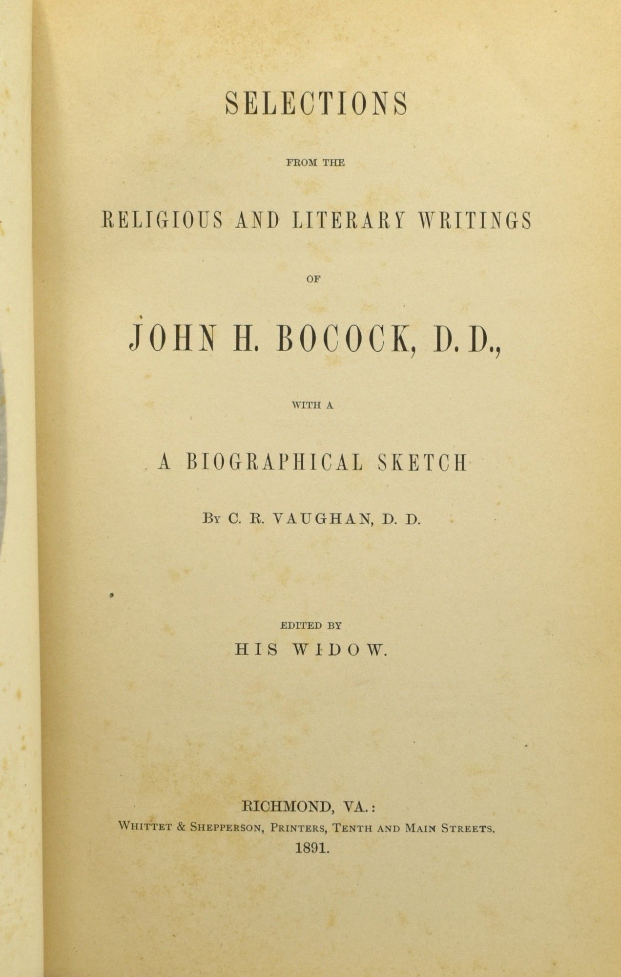 [LOUISA] [HARRISONBURG] SELECTIONS FROM THE RELIGIOUS AND LITERARY WRITINGS OF JOHN H. BOCOCK, D.D.