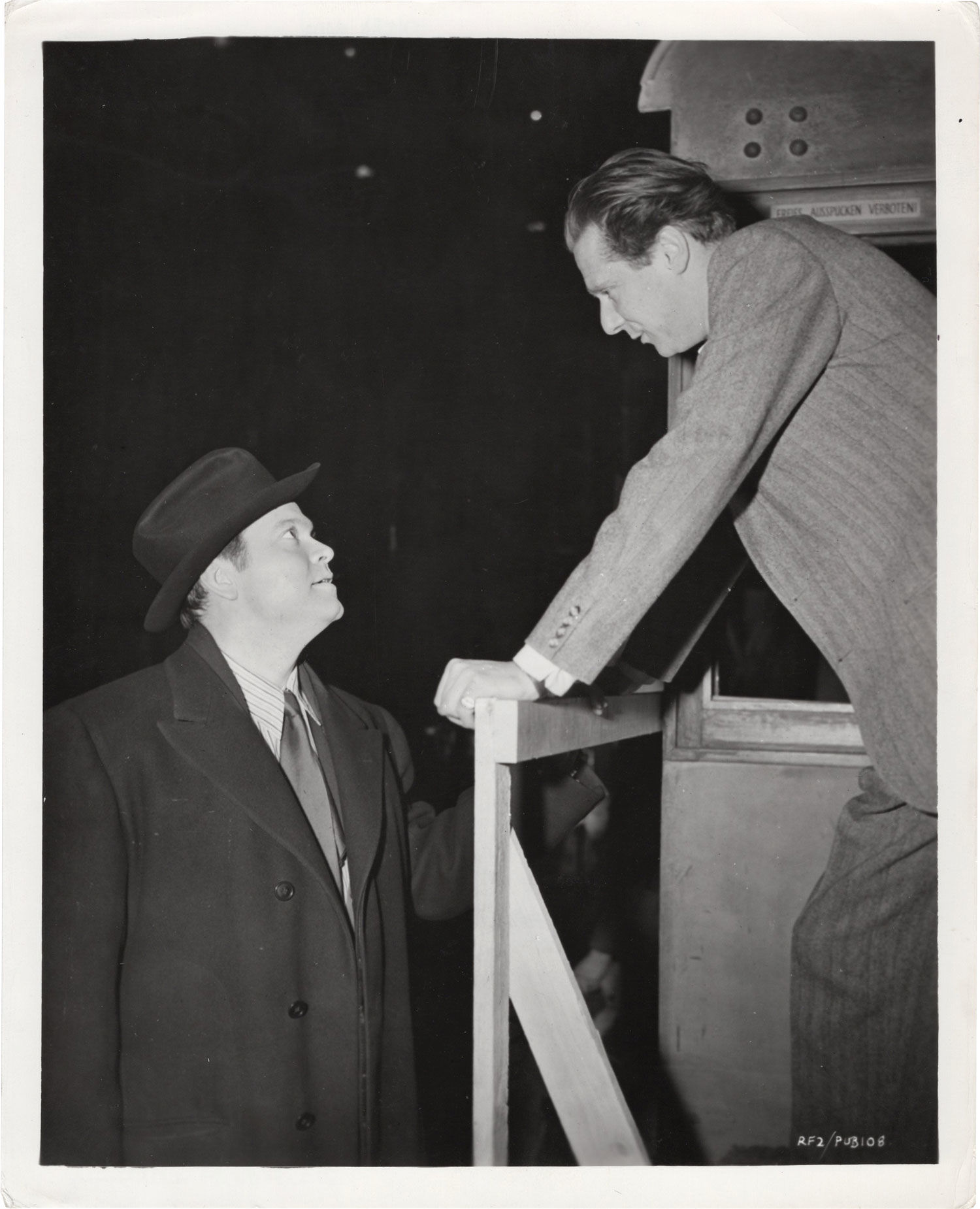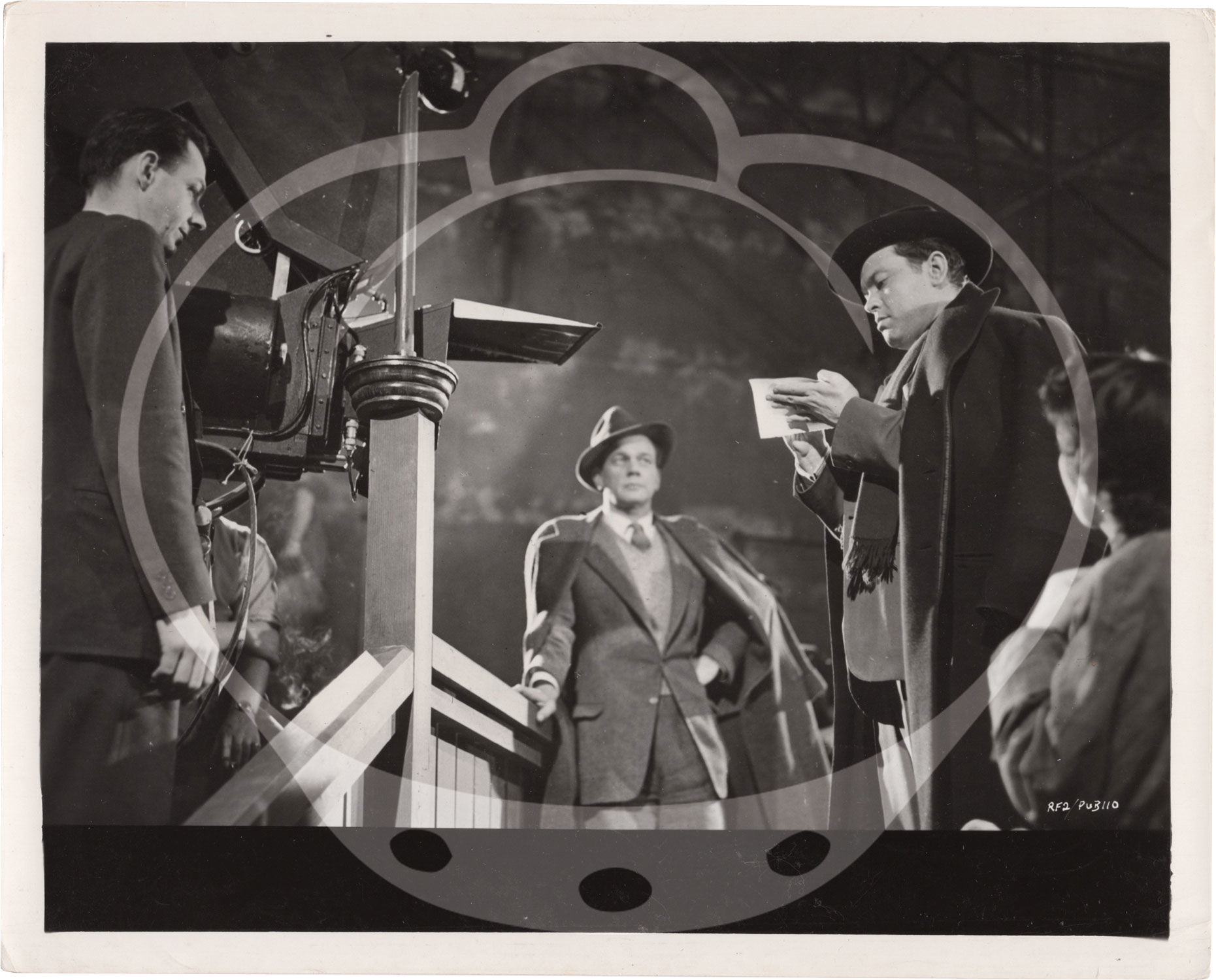 N.p.: N.p., 1949. Two vintage reference photographs, one of Orson Welles and Carol Reed, and one of Reed, Joseph Cotten, and Welles, on the set of the 1949 film.