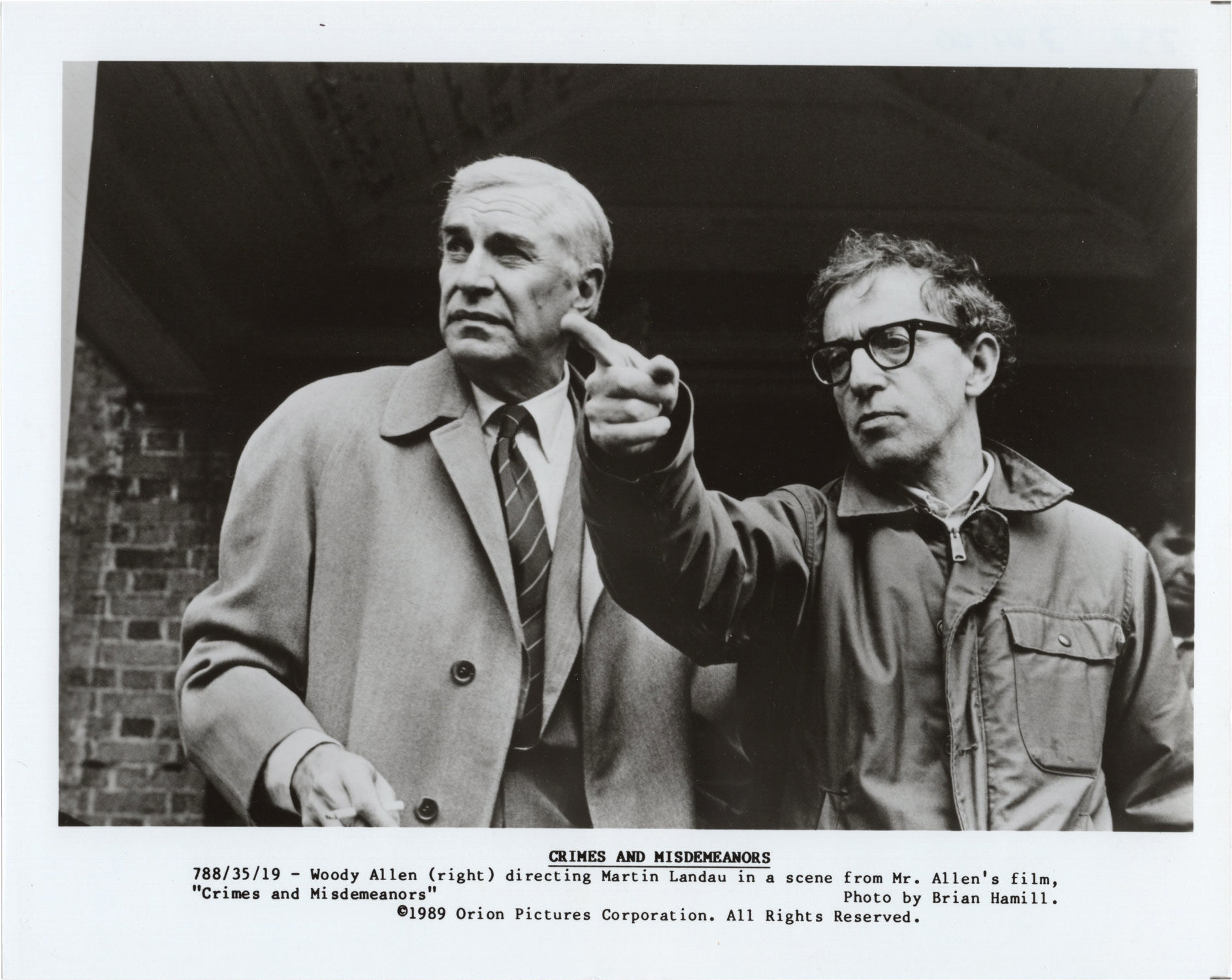 Beverly Hills, CA: Orion Pictures Corporation, 1989. Vintage reference photograph of Martin Landau and Woody Allen on the set of the 1989 film.
