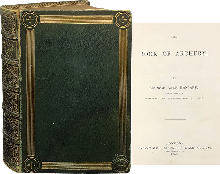 London: Longman, Orme, Brown, Green, and Longmans, 1840. First Edition. Hardcover. Good. About Good. Green leather signed by C. Lewis, generally rubbed at the edges and corners, split at the top two inches of the front board. glued dried on the spine so the spine edge is separated from the text block though the pages remain firmly attached to the binding. An extensive account of archery divided into twelve sections, including "Juvenile Bowmen," "Female Archery," "French Archery," "Greek and Roman Archery," among others.