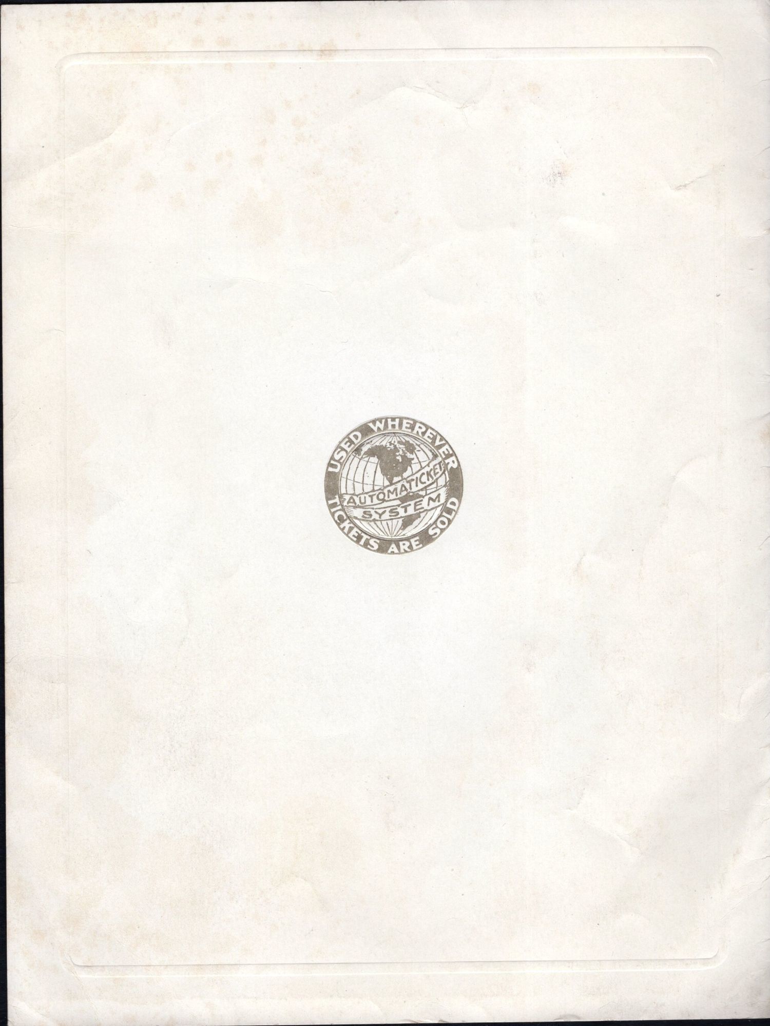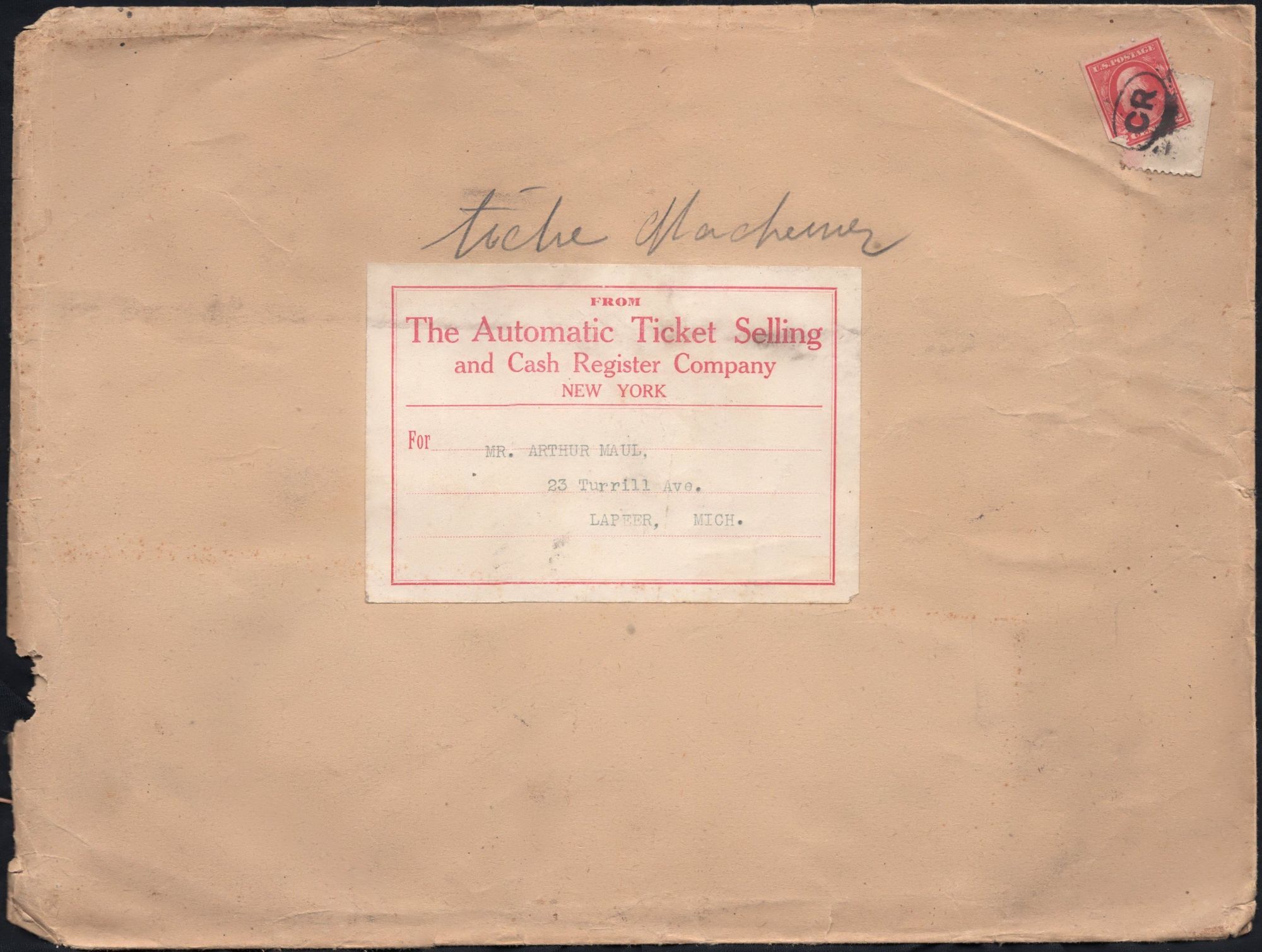 New York, NY: Automatic Ticket Selling & Cash Register Company, 1920. General wear.. An advertising booklet for the Automaticket, an ticket machine that allows business quickly sell the tickets while also keeping track of each ticket sold. The company sold each machine "with a 100% efficiency pledge" and it asserts that it "has helped to financial success" numerous companies. Several different versions of the machine were sold, and depending on the version purchased, one could sell from two to five different tickets at one time from the same machine. The company also sold the tickets for the machines as well, and had at the time of printing, sold over one billion tickets that year alone. There are six black and white photographs throughout, mainly of the machines, each which a gilt decorative element. The cover of the booklet has a black and white illustration of the globe with one of their ticket machines appearing in the sky like a modern day satellite. Comes with original mailing envelope addressed to a Mr. Arthur Maul in Lapeer, MI. 8 pgs. Illustrated wrappers. Staple binding. OCLC 0 (Nov. 2020). Dated via stamp. Measures 11 1/4" x 8 1/4" (booklet), 11 3/4 x 8 3/4