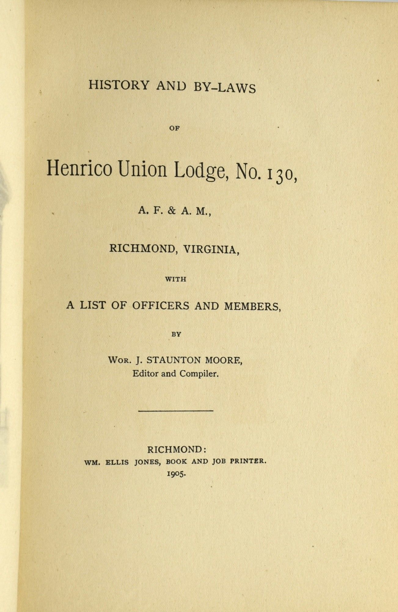 [MASONIC] HISTORY AND BY-LAWS OF HENRICO UNION LODGE, NO. 130, A. F. & A. M., RICHMOND, VIRGINIA, WITH A LIST OF OFFICERS AND MEMBERS