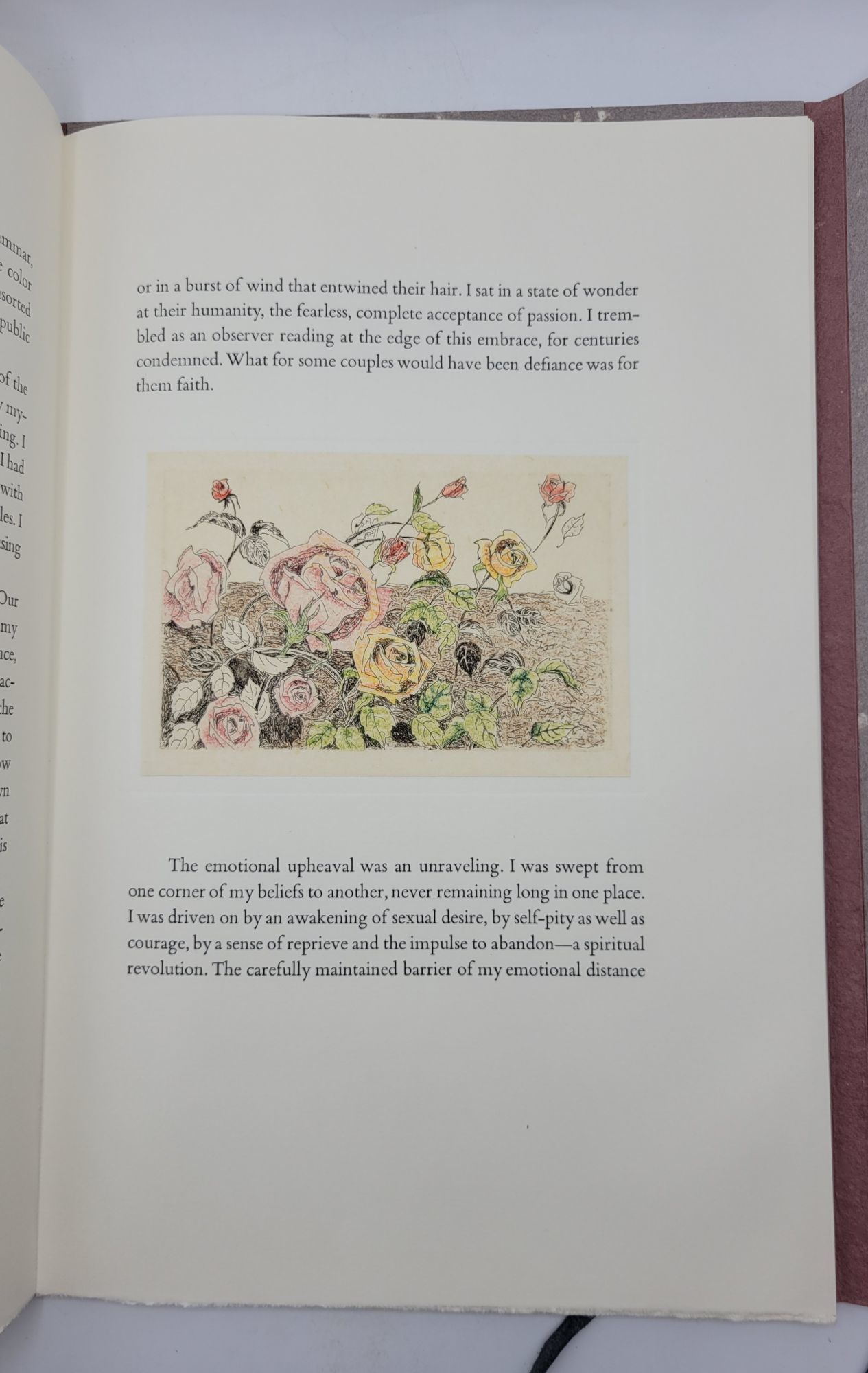 Knight Library Press; University of Oregon, 2000. Limited Edition. SIGNED. Thin folio [33 cm] Designed, printed and bound by Sandy Tilcock. Printed letterpress on Heine paper. The etchings are hand-colored by the artist. Calligraphic title, headings and ornaments by Marilyn Reaves. The cover was made by laminating two handmade papers: Moulin de Larroque's Brown and Twinrocker's Mica Rose. Binding tied together with a leather strap. With the instructions for the "Tying of Strap" laid in. Number 56 in an edition of 125 numbered copies. Signed by Barry Lopez and Robin Escher on the limitation page.